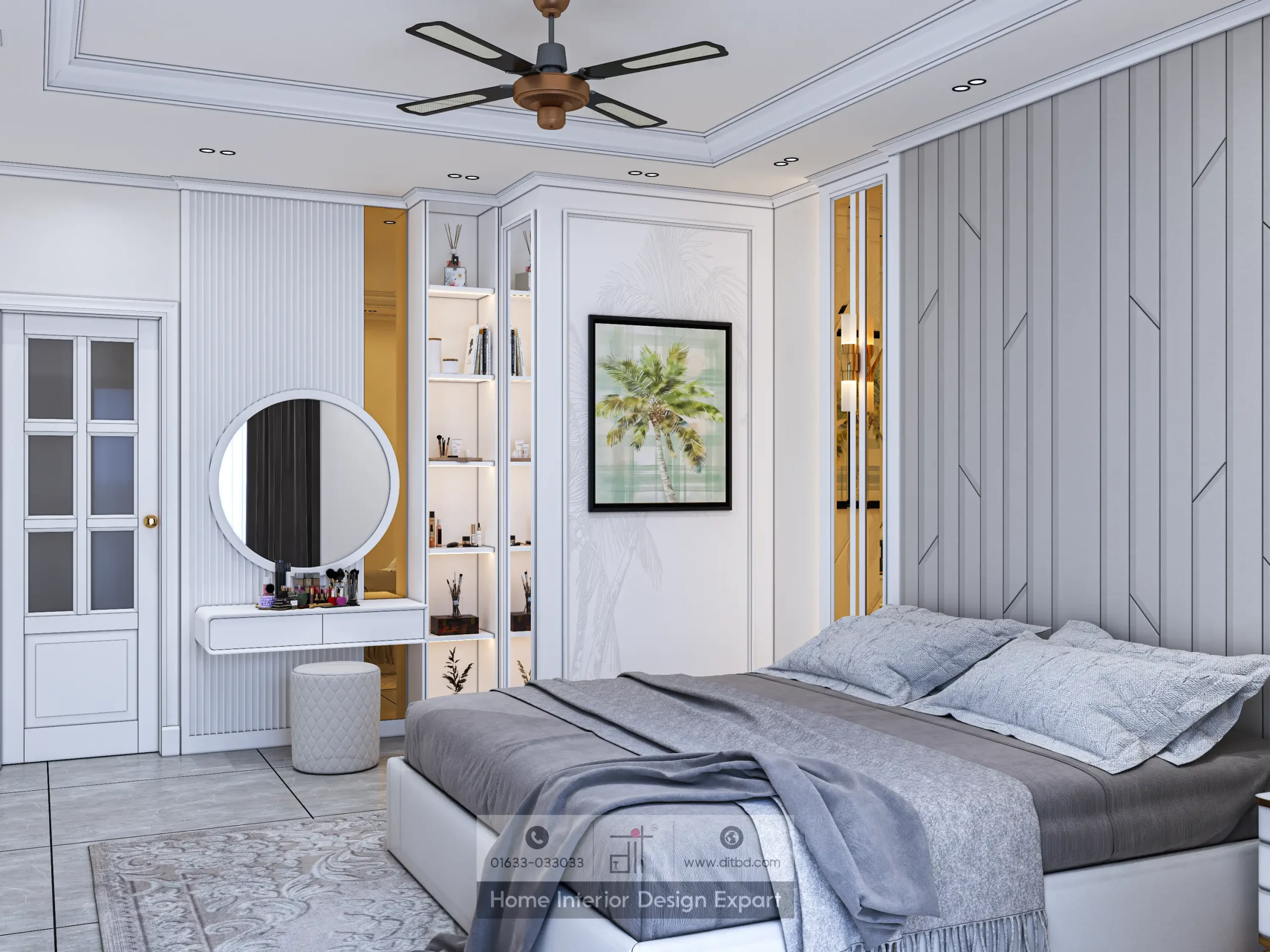 The dressing table designs exude a blend of modern elegance and functionality. It features a sleek, minimalist table with a large, round mirror framed in a metallic finish, adding a touch of sophistication. The table itself has clean lines and is complemented by a comfortable stool with a cushioned seat. The surface is adorned with a few essential items, such as a small vase with fresh flowers and a couple of beauty products, keeping it clutter-free and inviting. The backdrop includes a textured wall with soft, neutral tones, enhancing the overall serene and calming atmosphere. This design not only provides a practical space for daily grooming but also creates a stylish and welcoming corner in the room, making it a perfect blend of form and function.