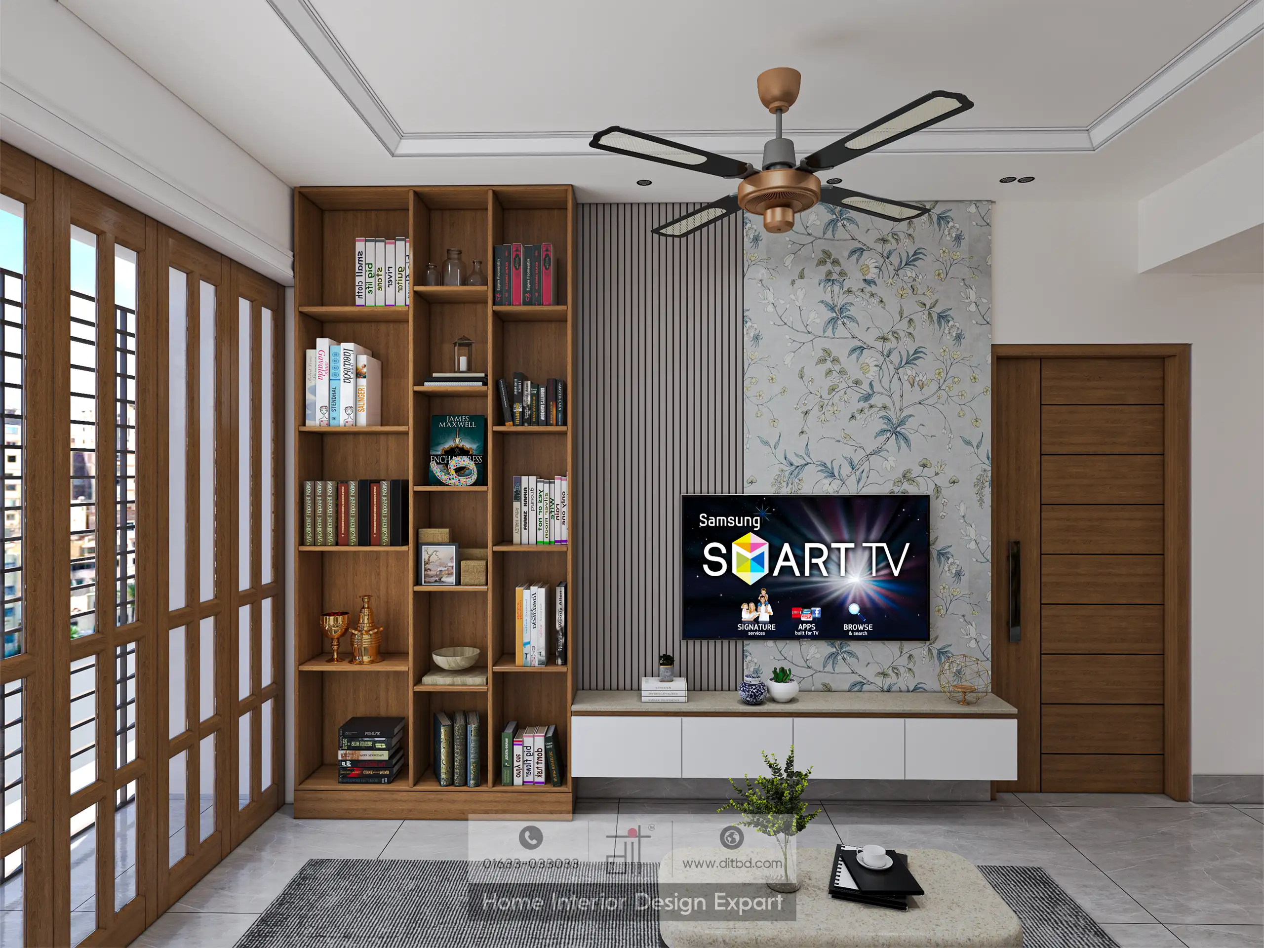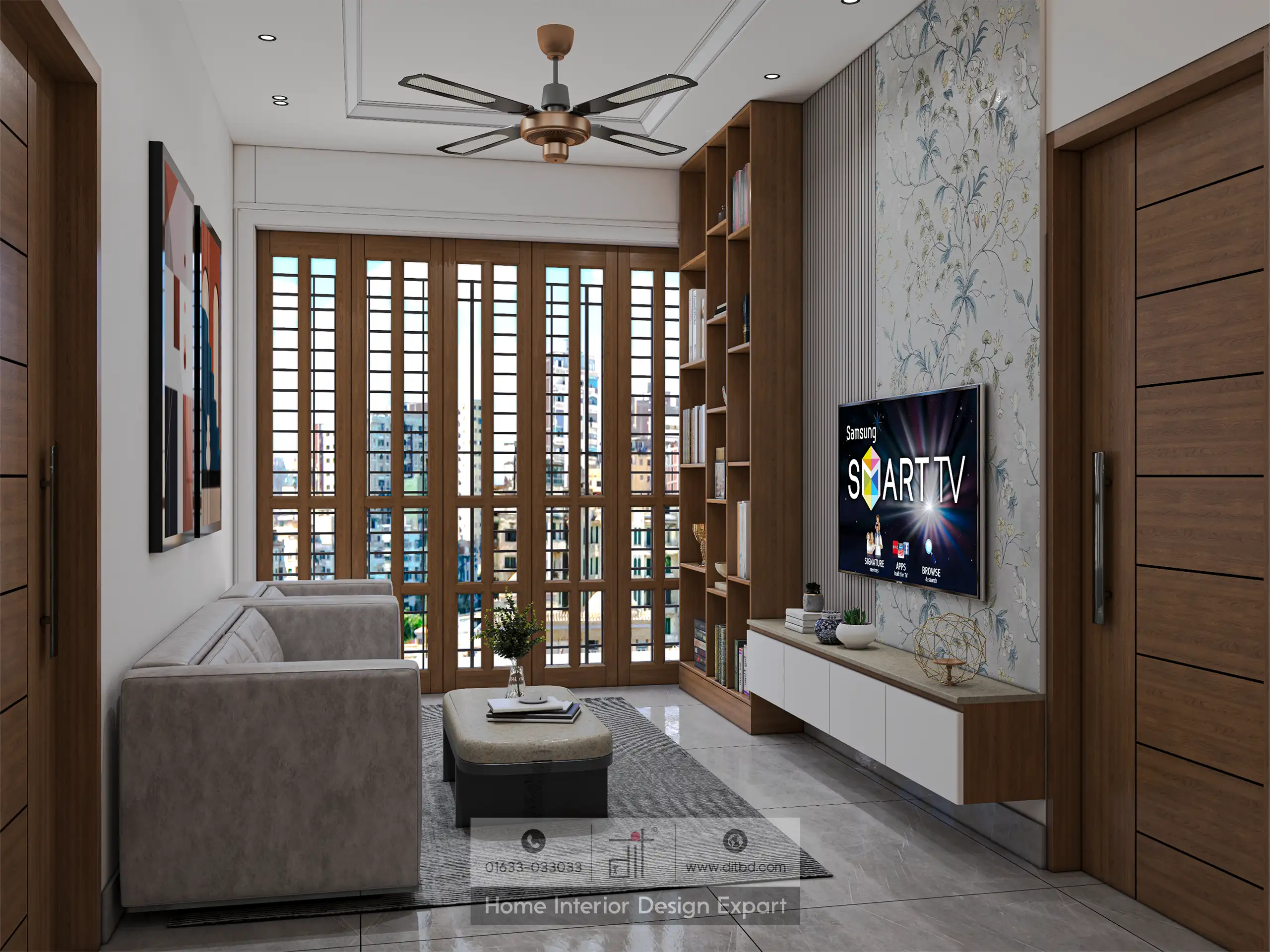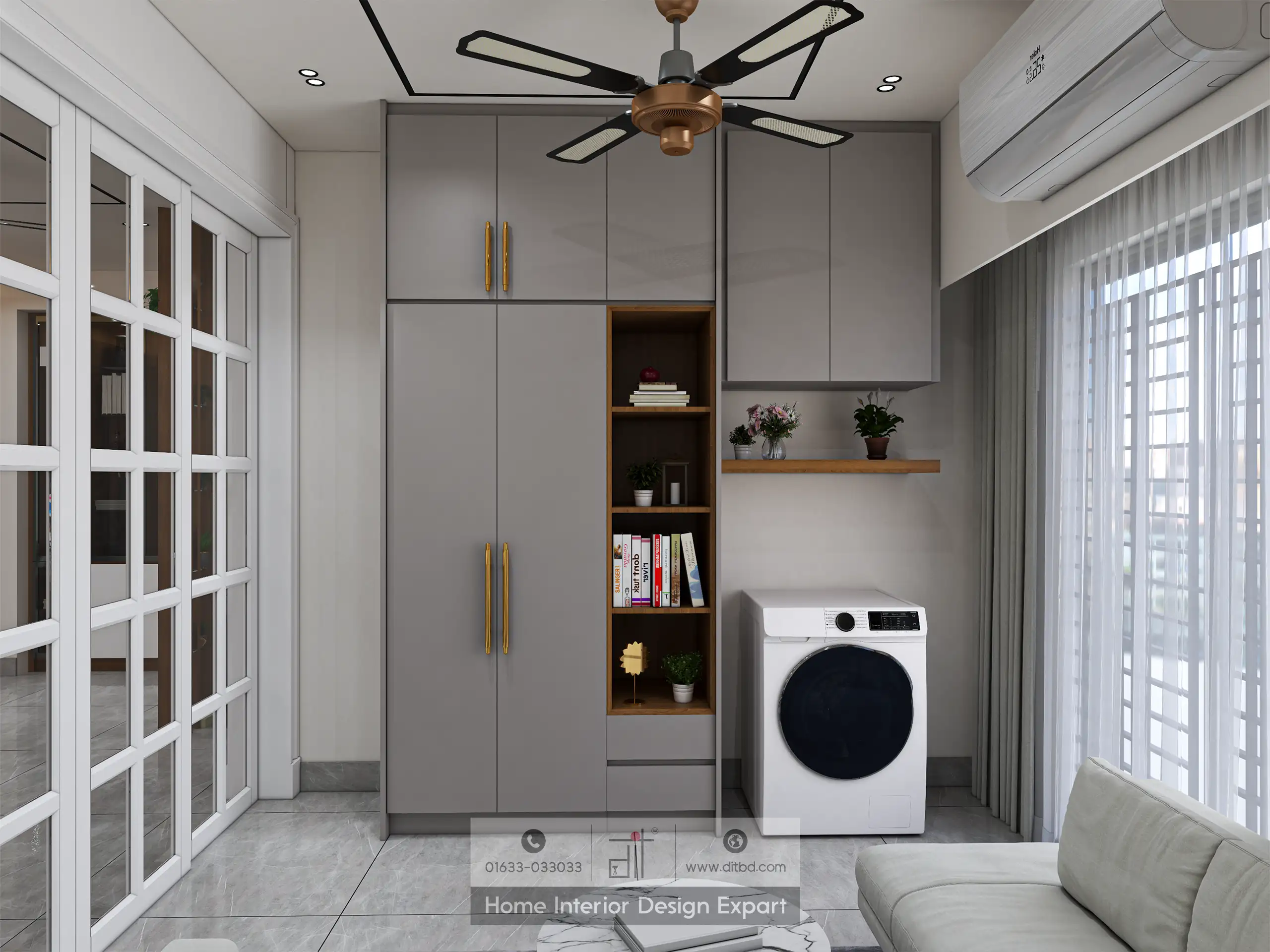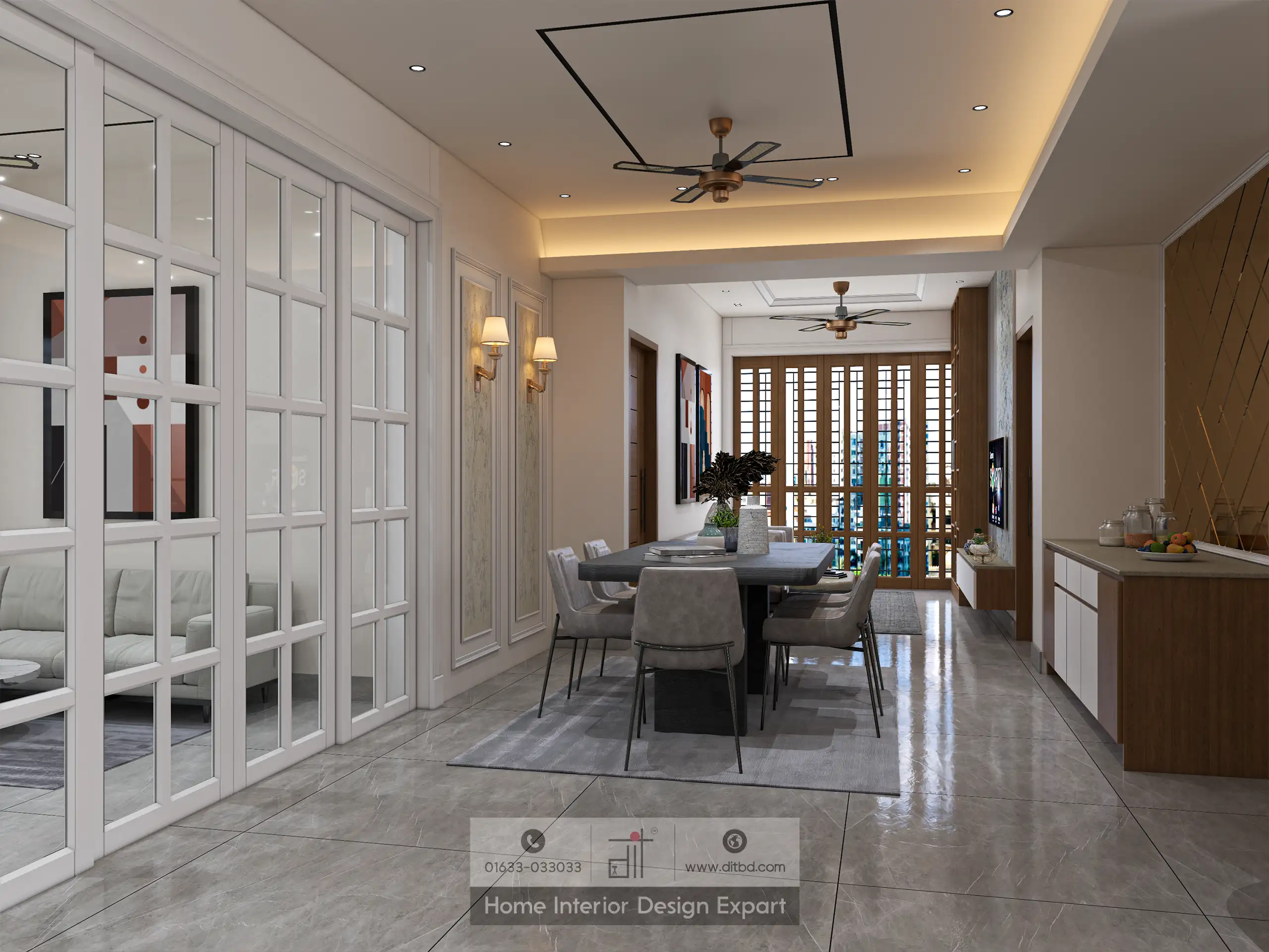The folding door design by DIT Studio is a versatile door that utilizes space management to make the best use of compact spaces. These doors are crafted with glass panels framed in sleek white or wooden borders, creating a clean and contemporary look. They serve as a versatile partition between different areas of the apartment, such as the dining area and living room, while still allowing natural light to flow through, maintaining an open and airy feel.