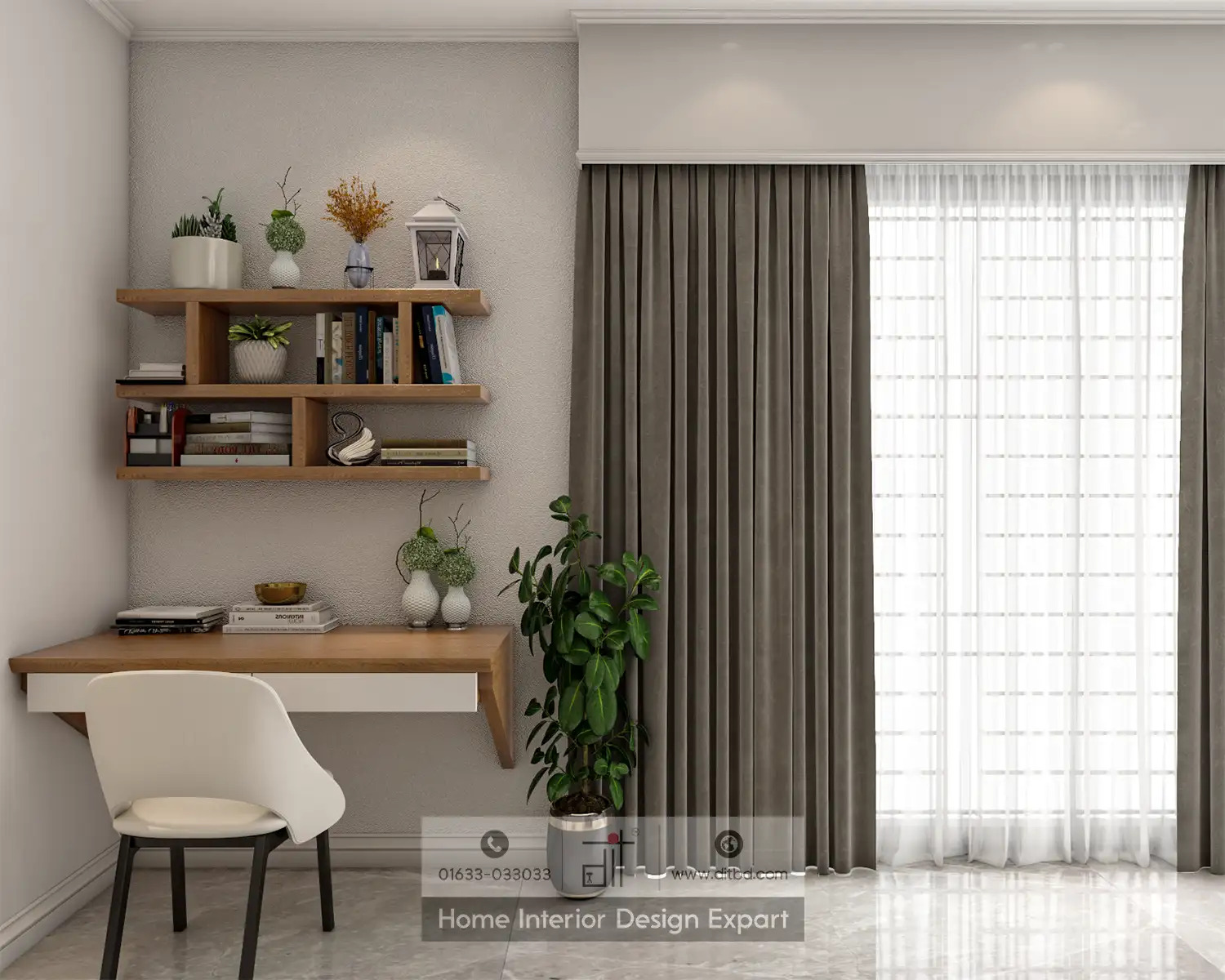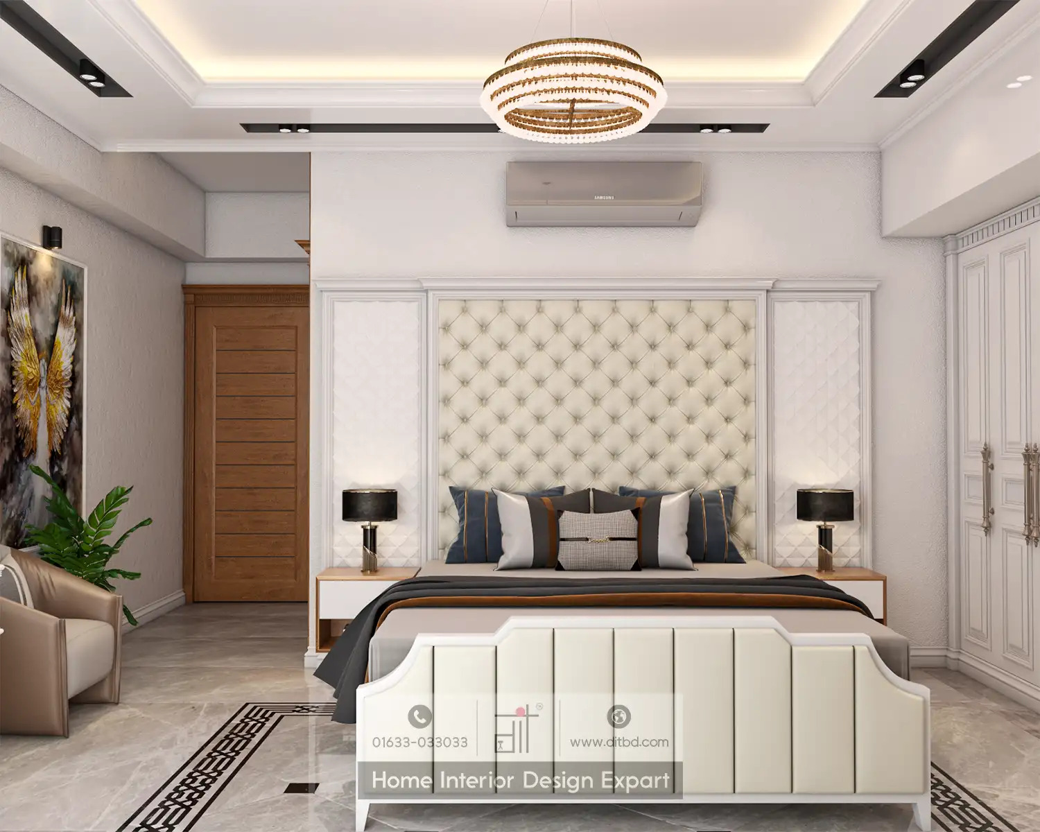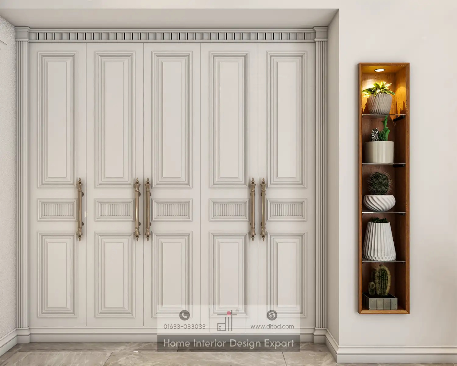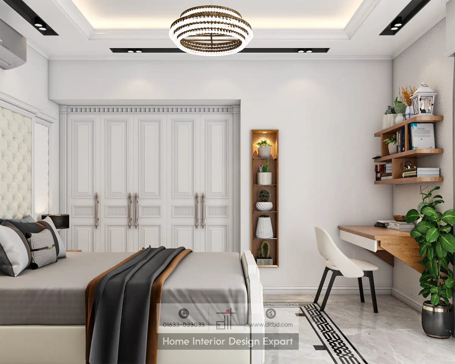 DIT Studio has designed this girl’s bedroom for a 3600-square-foot apartment. It features a sophisticated and elegant look with a focus on functionality and aesthetics. The vanity area includes a large mirror, white cabinetry, and a comfortable chair, decorated with plants and small decorative items for a clean and organized look. The main sleeping area has a bed with a tufted headboard, flanked by nightstands with lamps, and a modern chandelier above. There’s also a study area with a desk, chair, and shelves filled with books and decorative items. The hallway leading to the bedroom is decorated with plants and artwork, providing a welcoming entrance. The closet area features large white doors and a small shelving unit with decorative items. The overall design is modern and elegant, with a cohesive color scheme of white, beige, and light wood tones. It is well-lit with both natural and artificial lighting, creating a bright and inviting atmosphere. The use of plants and artwork adds a touch of personality and warmth to the space.