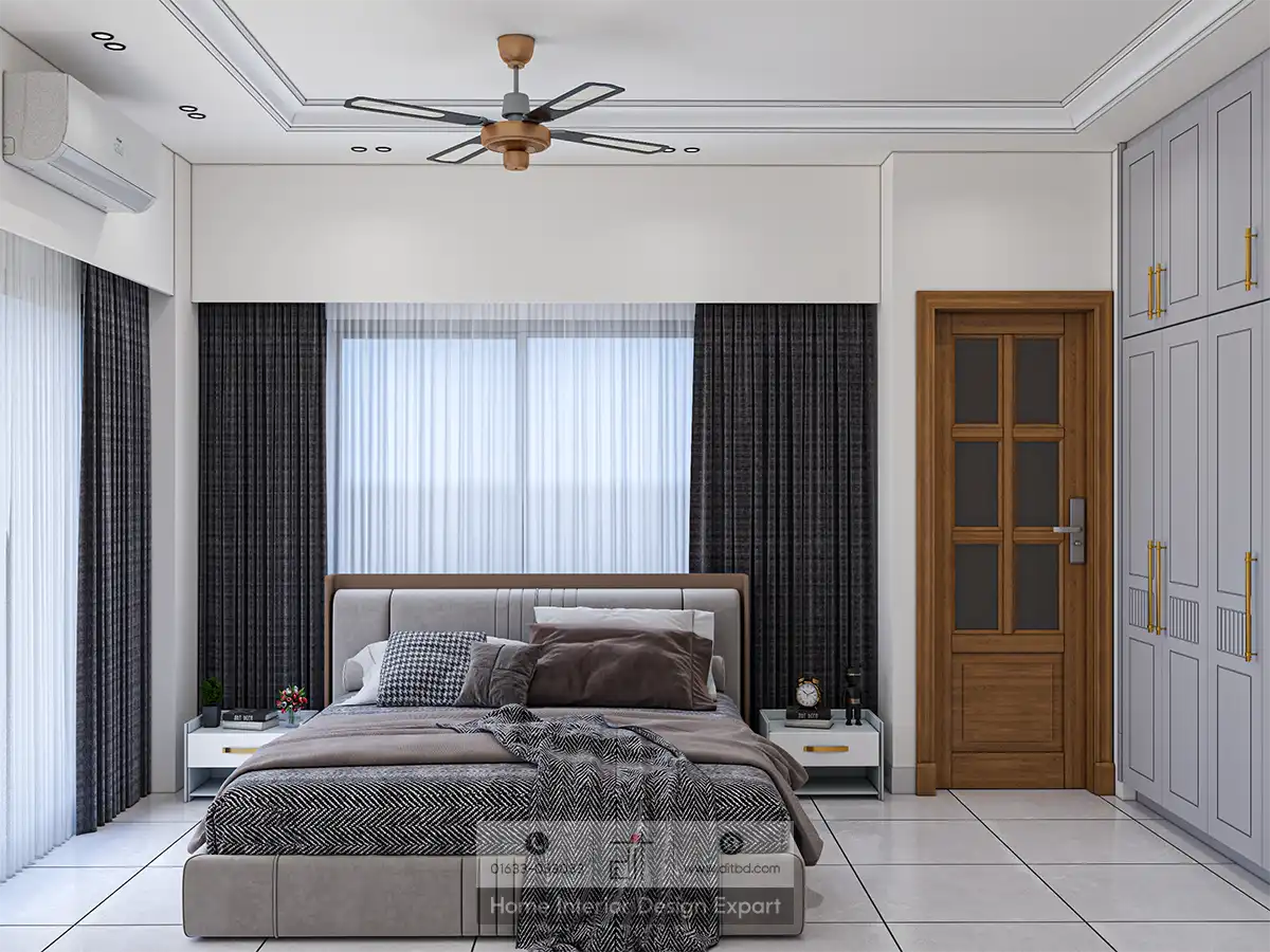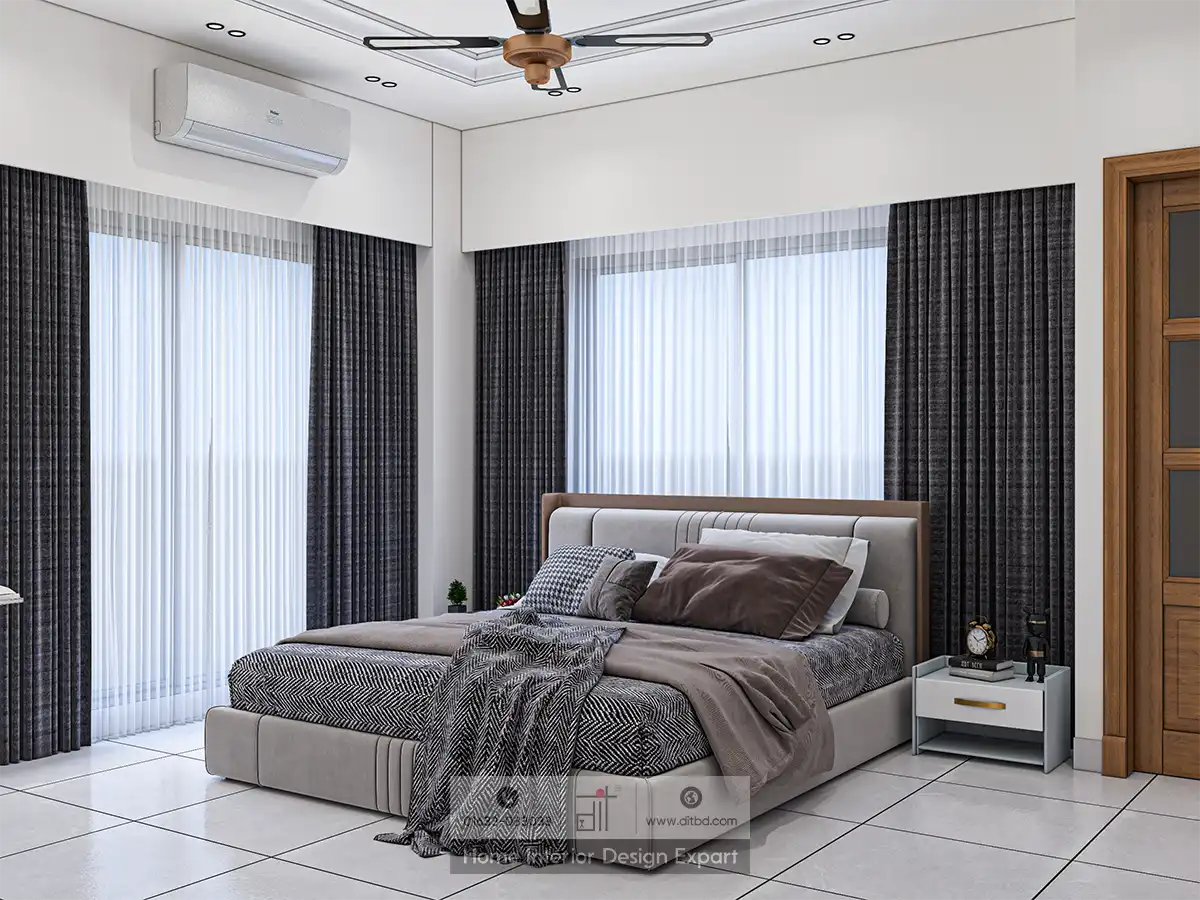 The luxury bedroom design by DIT Studio exudes elegance and sophistication. The room features a spacious layout with a large, comfortable bed as the centerpiece. The bed is surrounded by sleek, modern nightstands, each topped with stylish lamps that provide soft, ambient lighting. The walls are painted in a soothing, neutral color, creating a calm and relaxing atmosphere that can lead to good sleep.