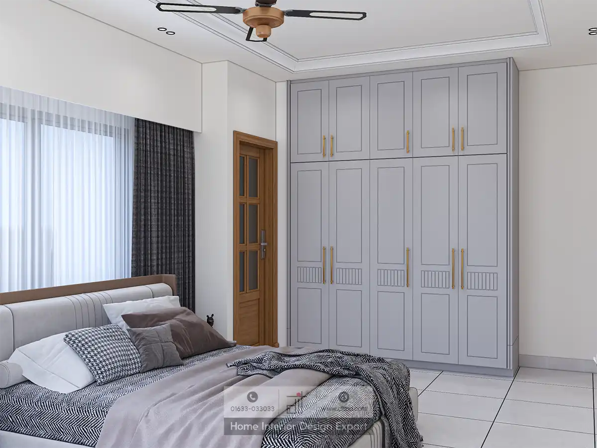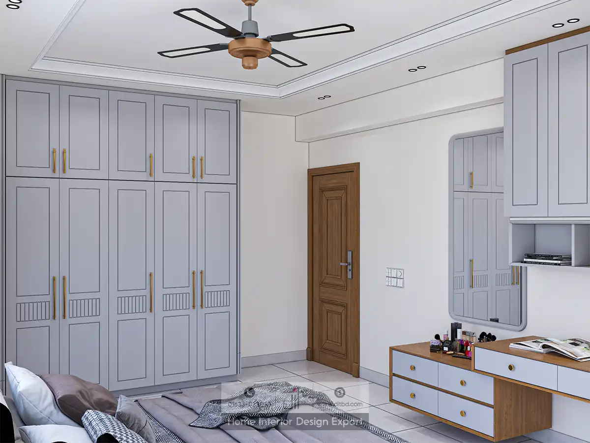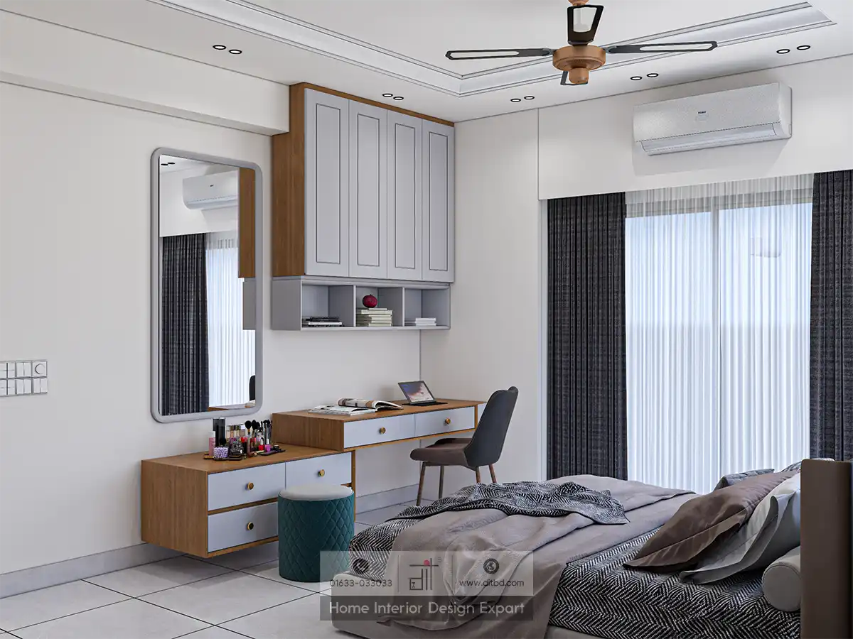 A significant feature of the design is the ample storage space provided by the built-in wardrobes. These wardrobes are designed with clean lines and elegant handles, seamlessly blending into the room’s decor. A dedicated vanity area is also included, featuring a large mirror and a stylish chair, perfect for personal grooming and preparation.
