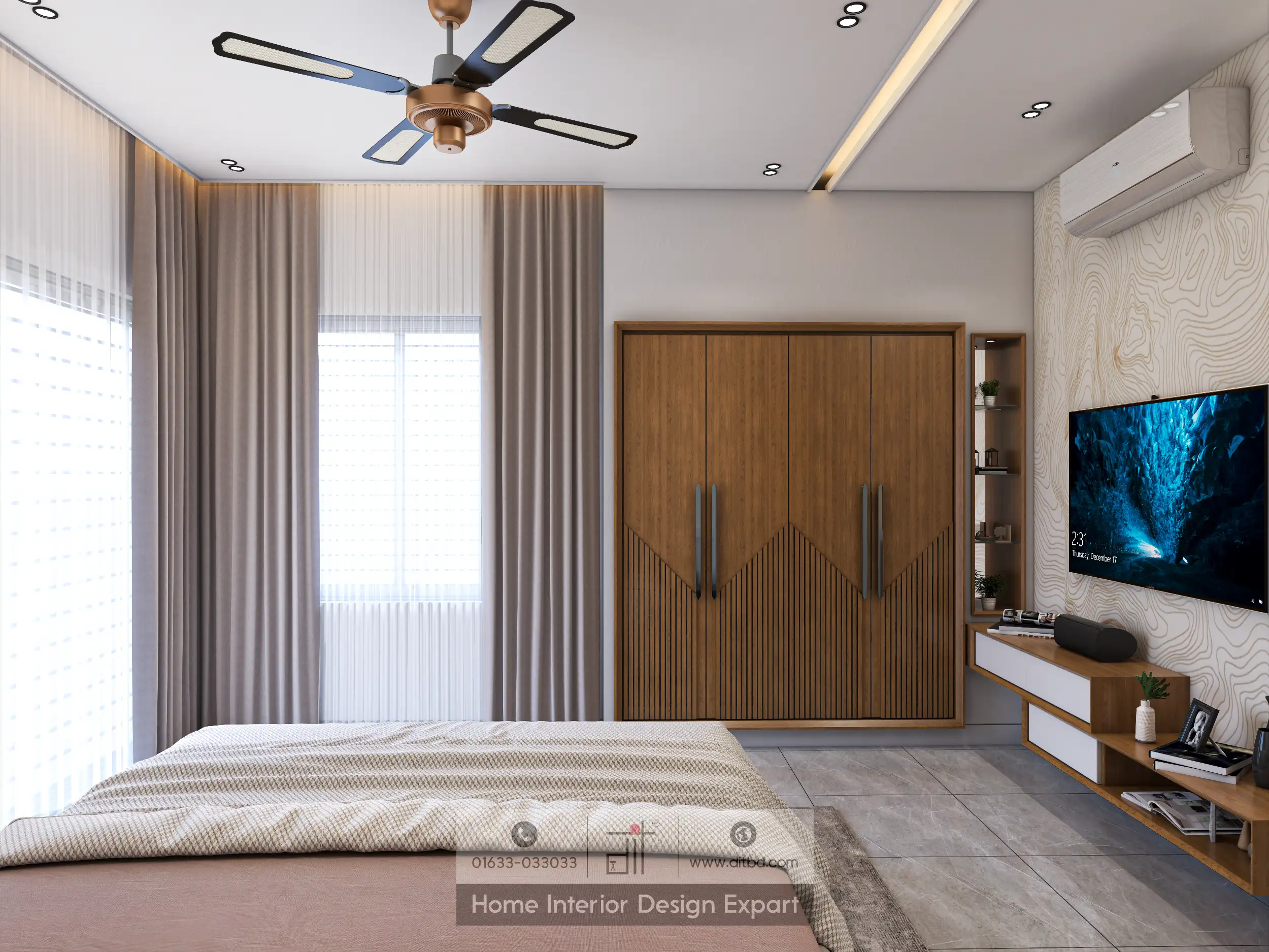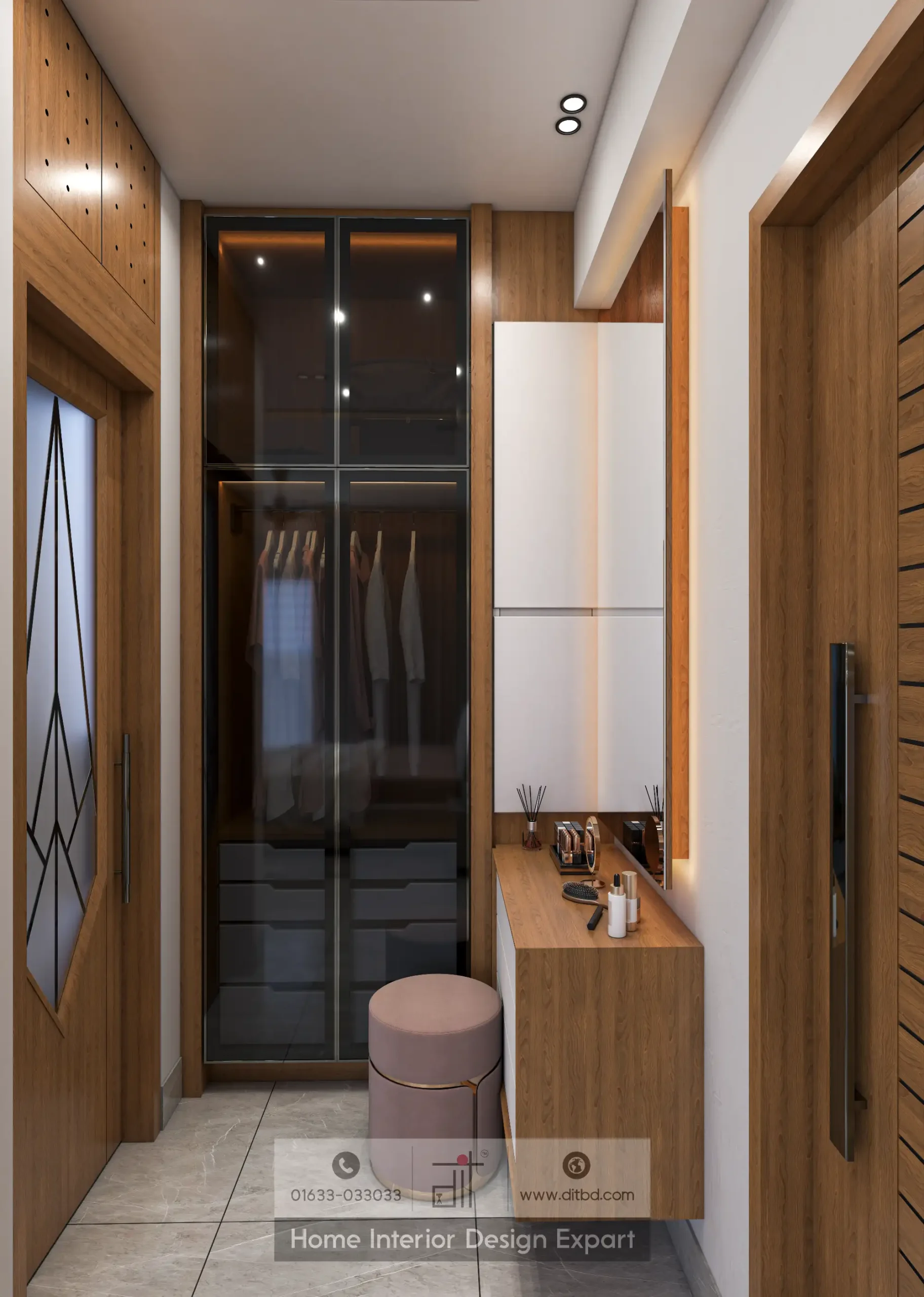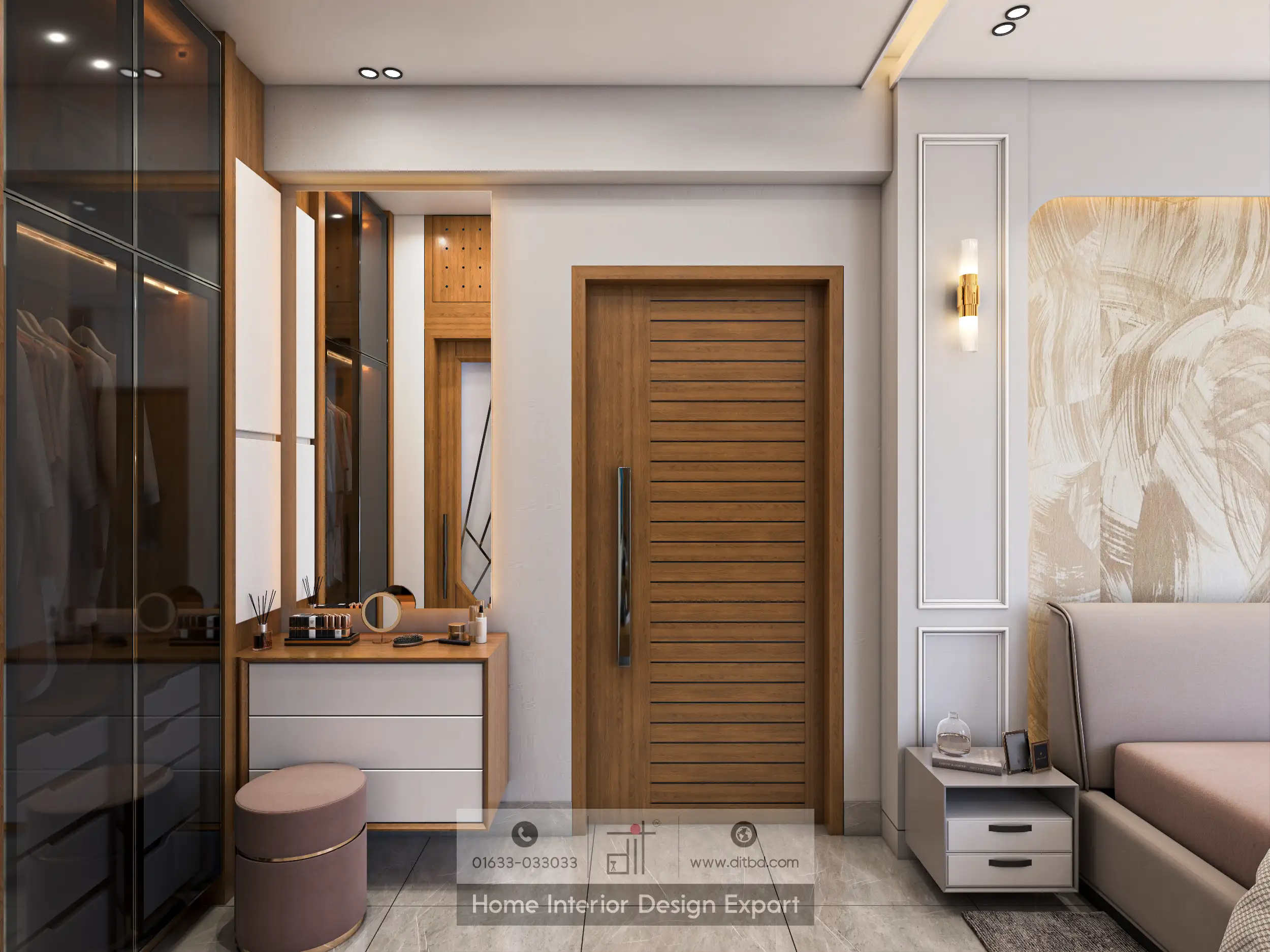 The room also includes a well-organized dressing area with a vanity table, a comfortable stool, and a large mirror, providing a practical and stylish space for personal grooming. The built-in wardrobe with glass doors offers ample storage and keeps the room clutter-free. The ceiling fan with recessed lighting adds a touch of modern sophistication while ensuring comfort in all seasons.