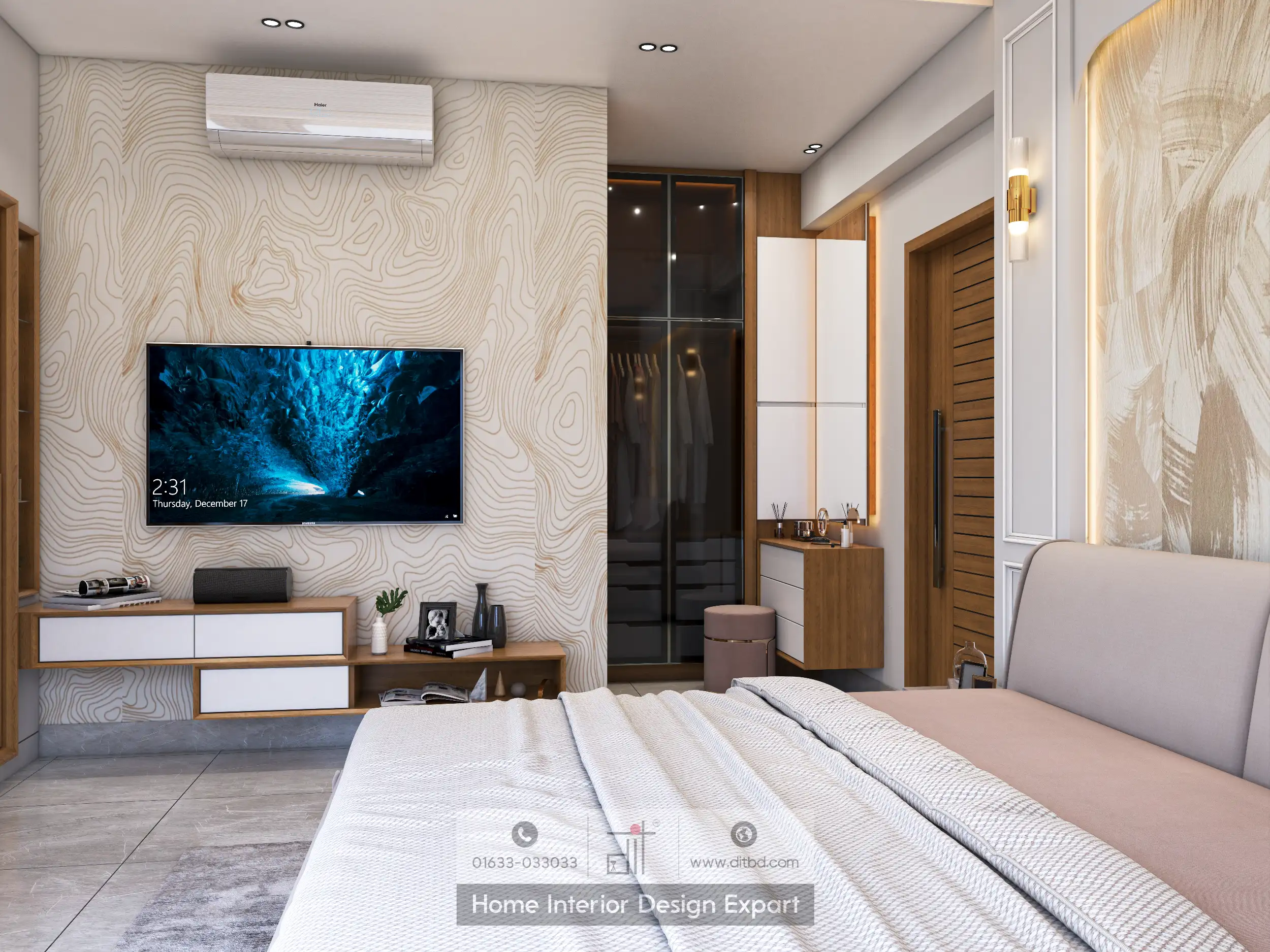 The luxury bedroom design exudes a sense of modern elegance and tranquility. The spacious room features a large, inviting bed with a tufted headboard, creating a cozy and sophisticated focal point. The bed is adorned with soft, neutral-toned bedding and decorative pillows, ensuring a restful night’s sleep.