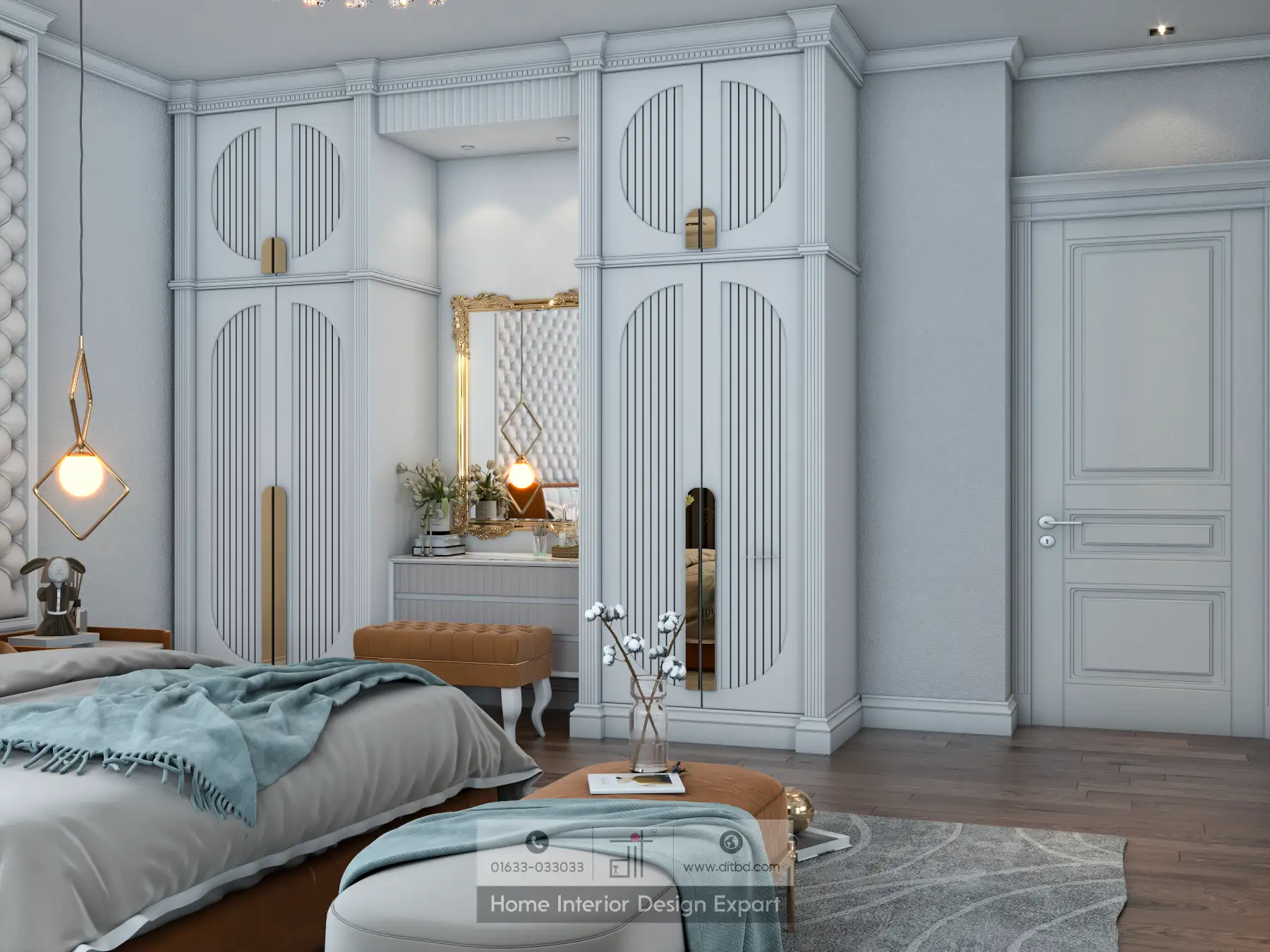 The luxury closet design showcases a sophisticated and functional space, designed to provide ample storage while maintaining an elegant aesthetic. The closet features a combination of white and wooden elements, creating a clean and minimalist look. The use of sleek, paneled doors with gold handles adds a touch of opulence, while the central mirrored section enhances the sense of space and light.
