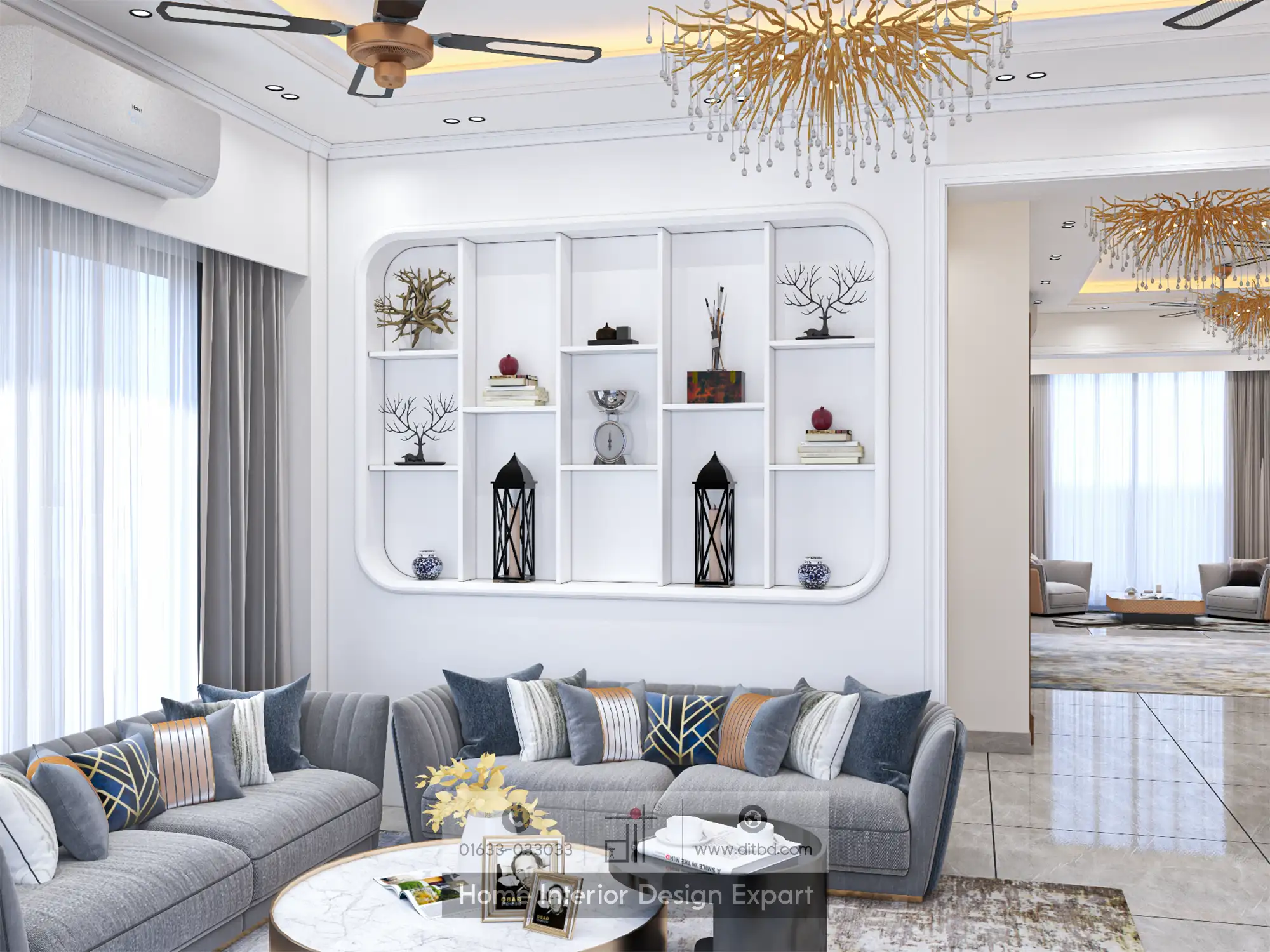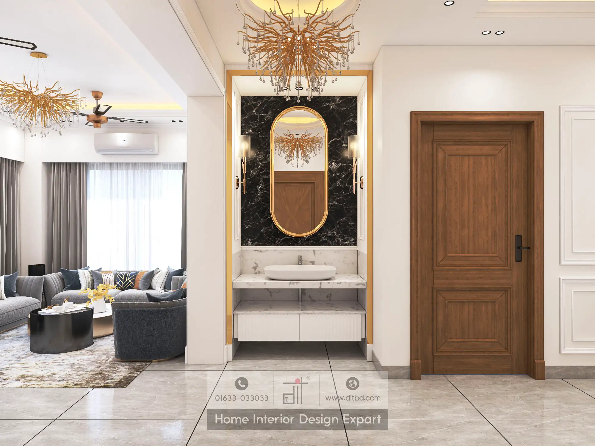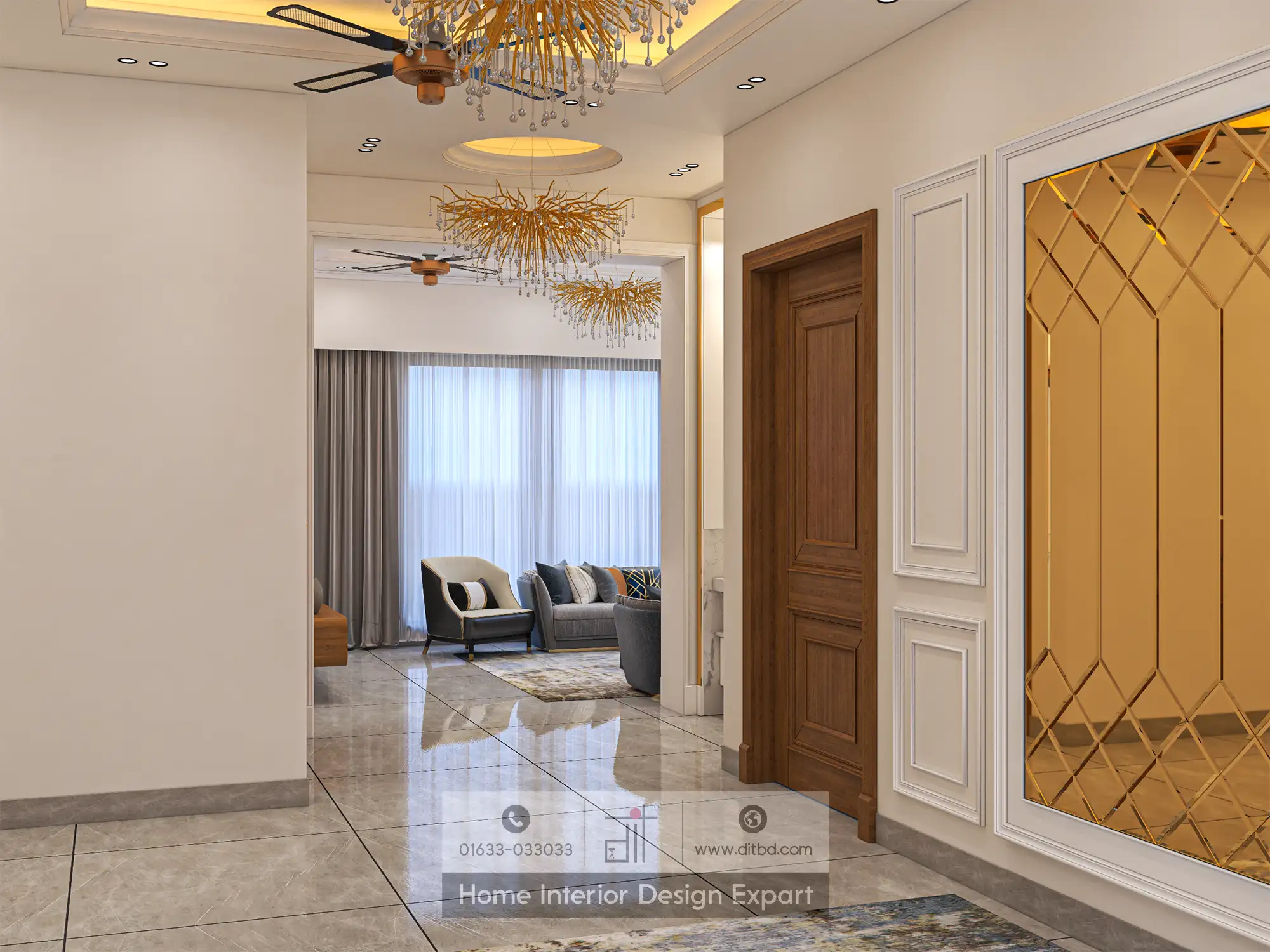 This luxury common space with an organized seating arrangement features plush sofas and armchairs, centered around a sleek coffee table, providing a perfect spot for relaxation and socializing. Large windows with sheer curtains allow natural light to flood the room, enhancing the airy and open feel. The ceiling is adorned with intricate chandeliers and recessed lighting, adding a touch of opulence to the space. The walls are a blend of mirrors, wooden panels, and built-in shelves displaying decorative items, creating a visually appealing and dynamic environment. A large flat-screen television is mounted on the wall, seamlessly integrating modern technology into the design. The polished marble tile flooring adds a luxurious touch, reflecting the light and contributing to the overall brightness of the room. This common space is not just a place to gather; it’s a sanctuary where you can unwind, entertain, and enjoy the finer things in life.