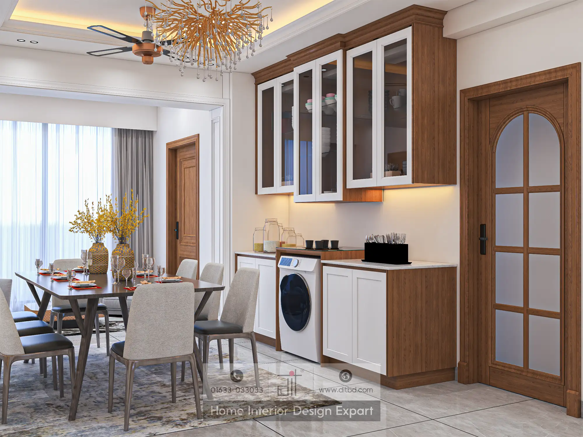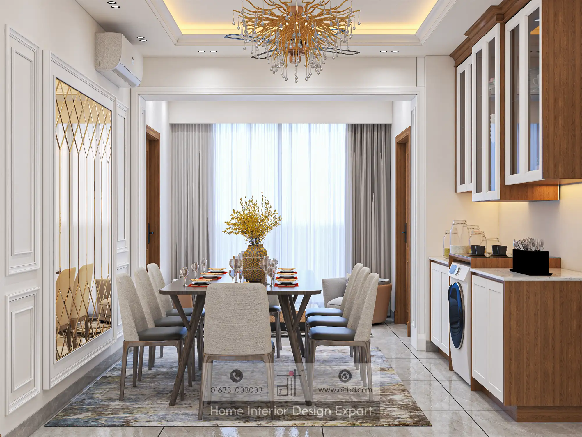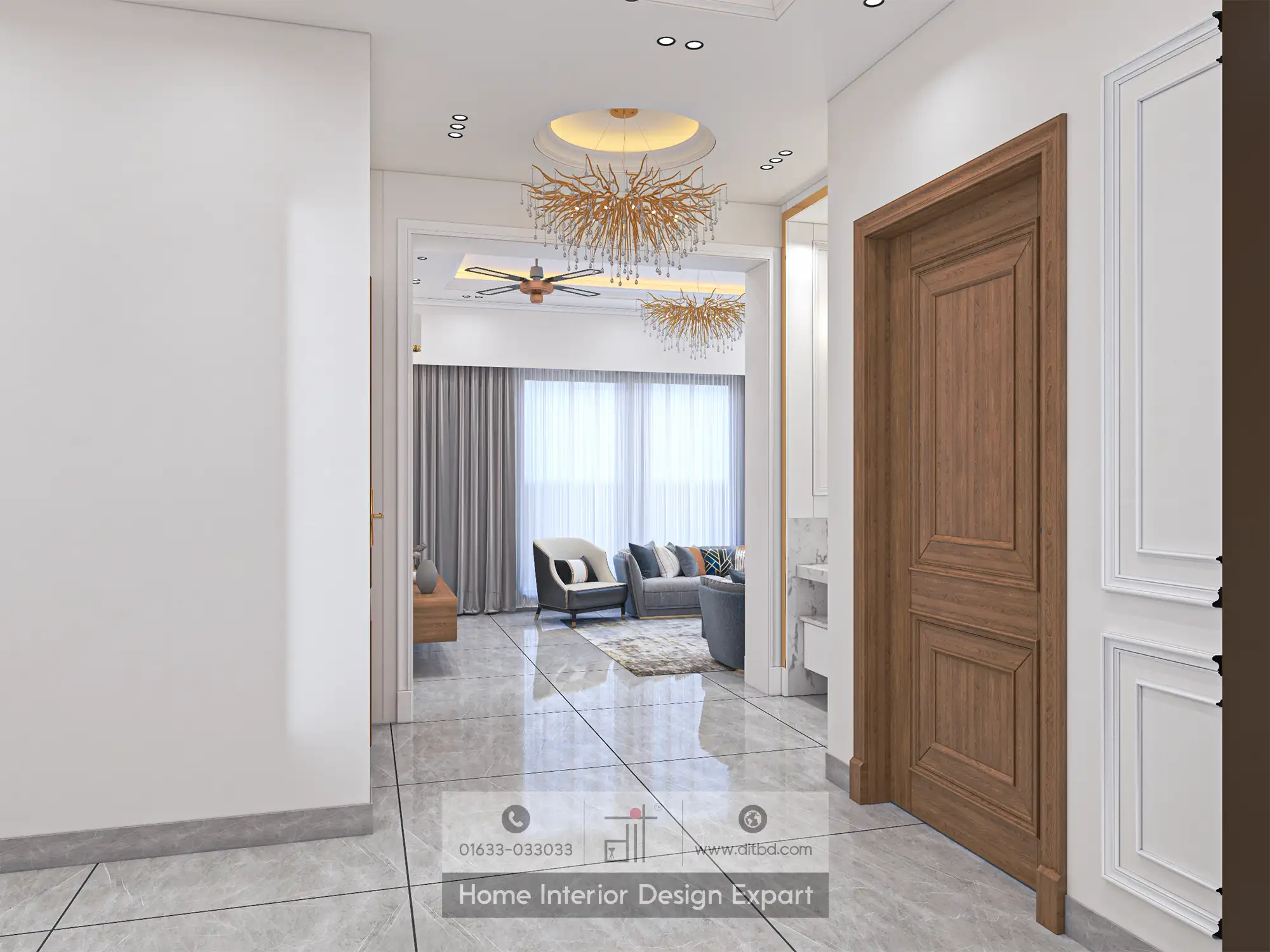 This luxury common space with an organized seating arrangement features plush sofas and armchairs, centered around a sleek coffee table, providing a perfect spot for relaxation and socializing. Large windows with sheer curtains allow natural light to flood the room, enhancing the airy and open feel. The ceiling is adorned with intricate chandeliers and recessed lighting, adding a touch of opulence to the space. The walls are a blend of mirrors, wooden panels, and built-in shelves displaying decorative items, creating a visually appealing and dynamic environment. A large flat-screen television is mounted on the wall, seamlessly integrating modern technology into the design. The polished marble tile flooring adds a luxurious touch, reflecting the light and contributing to the overall brightness of the room. This common space is not just a place to gather; it’s a sanctuary where you can unwind, entertain, and enjoy the finer things in life.