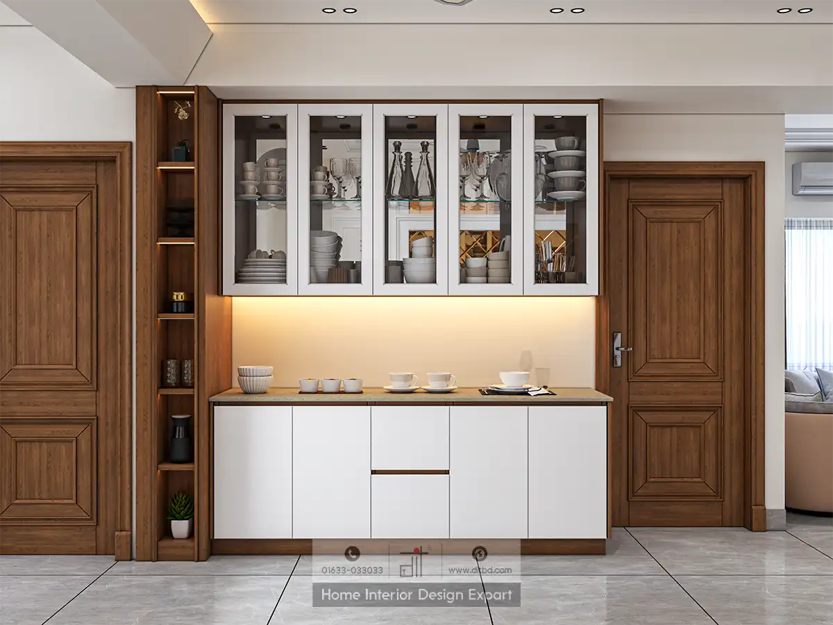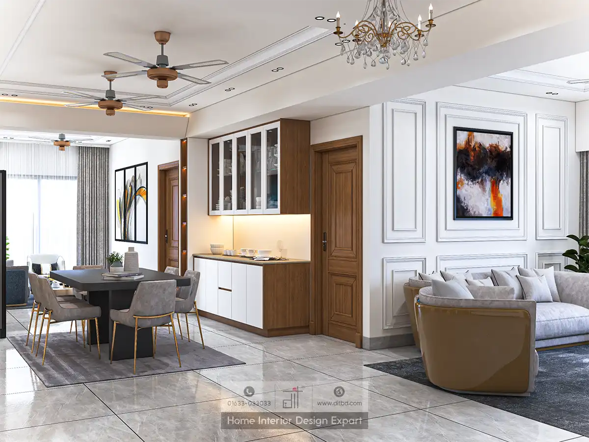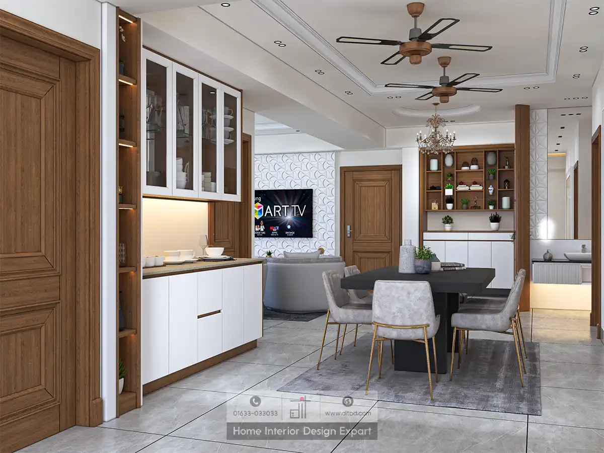 The dining area boasts a stylish dining table with six upholstered chairs, set against a backdrop of built-in cabinetry with glass-fronted doors displaying decorative items. This creates a perfect setting for intimate dinners or gatherings with friends and family. The use of neutral tones, such as white, beige, and wood accents, creates a warm and inviting atmosphere.