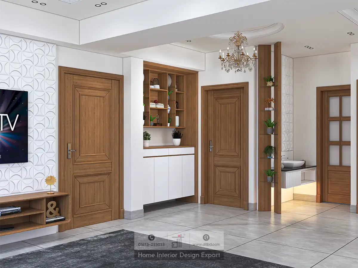 The kitchen area is equipped with modern appliances, including a double-door refrigerator, and offers ample storage space with a combination of open shelves and closed cabinets. Polished marble tile flooring throughout the space adds to the luxurious feel, while decorative elements like framed artwork, mirrors, and indoor plants enhance the overall aesthetic.