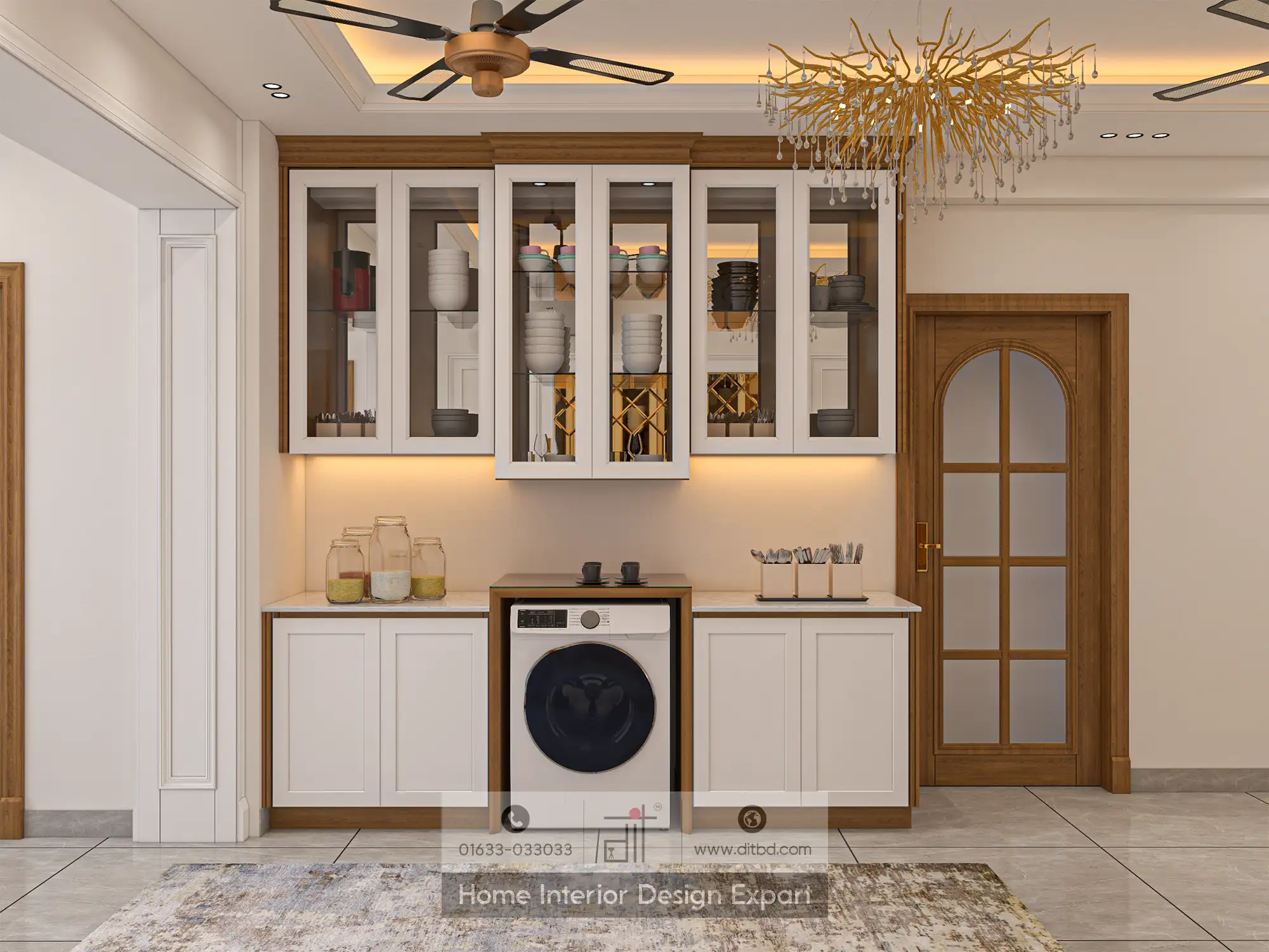 The walls are adorned with decorative panels and mirrors, enhancing the sense of space and light. The cabinetry is sleek and modern, with glass-fronted doors that showcase fine glassware. The cabinetry also includes integrated appliances, such as a washing machine, seamlessly blending practicality with style.