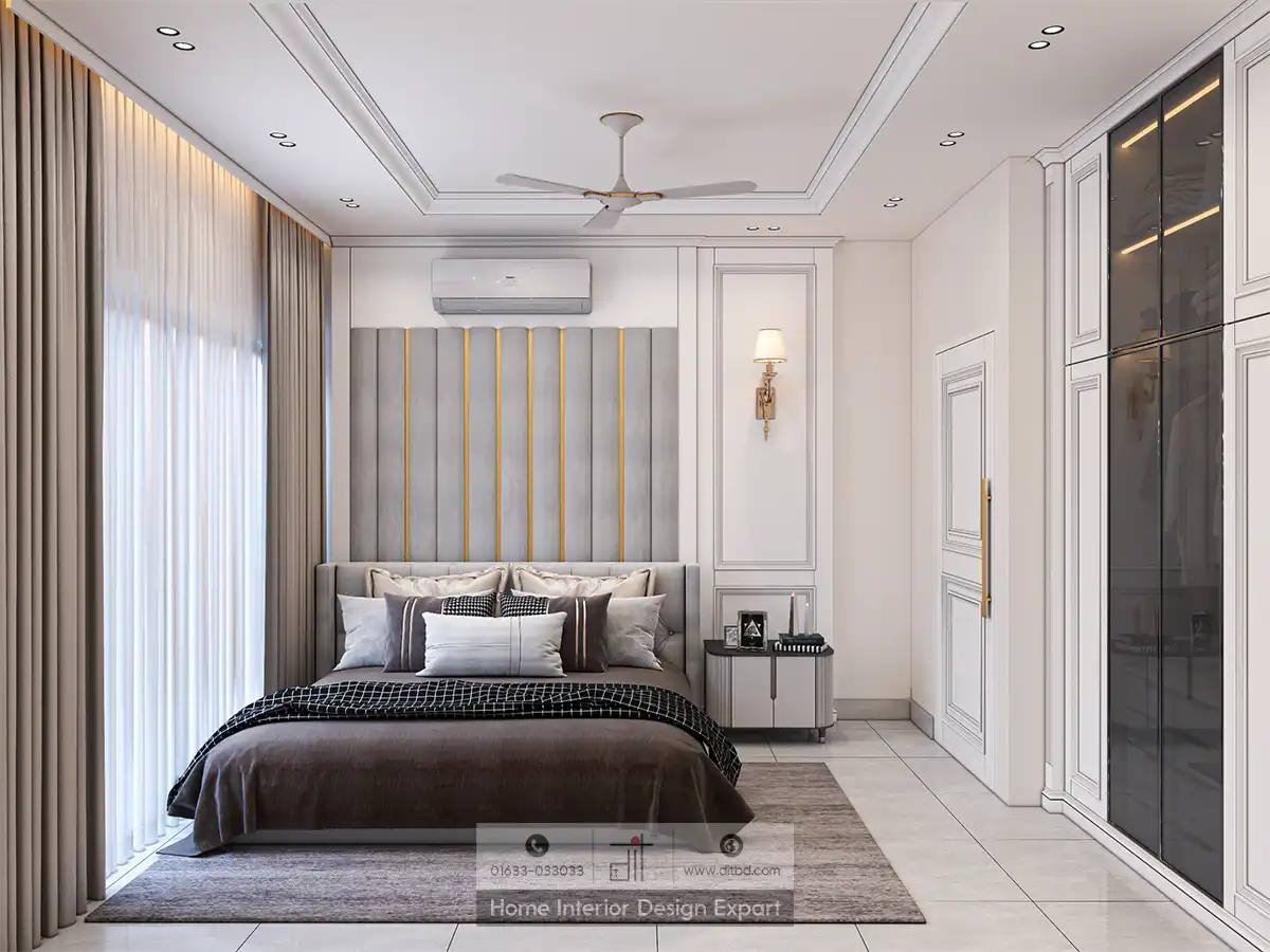 This luxurious girl’s bedroom is a sanctuary of elegance and comfort, designed to make her feel cherished and inspired. The room features a spacious, cozy bed adorned with plush pillows and a stylish headboard, creating a perfect spot for restful nights and sweet dreams. The vertical striped paneling on the wall adds a touch of sophistication.