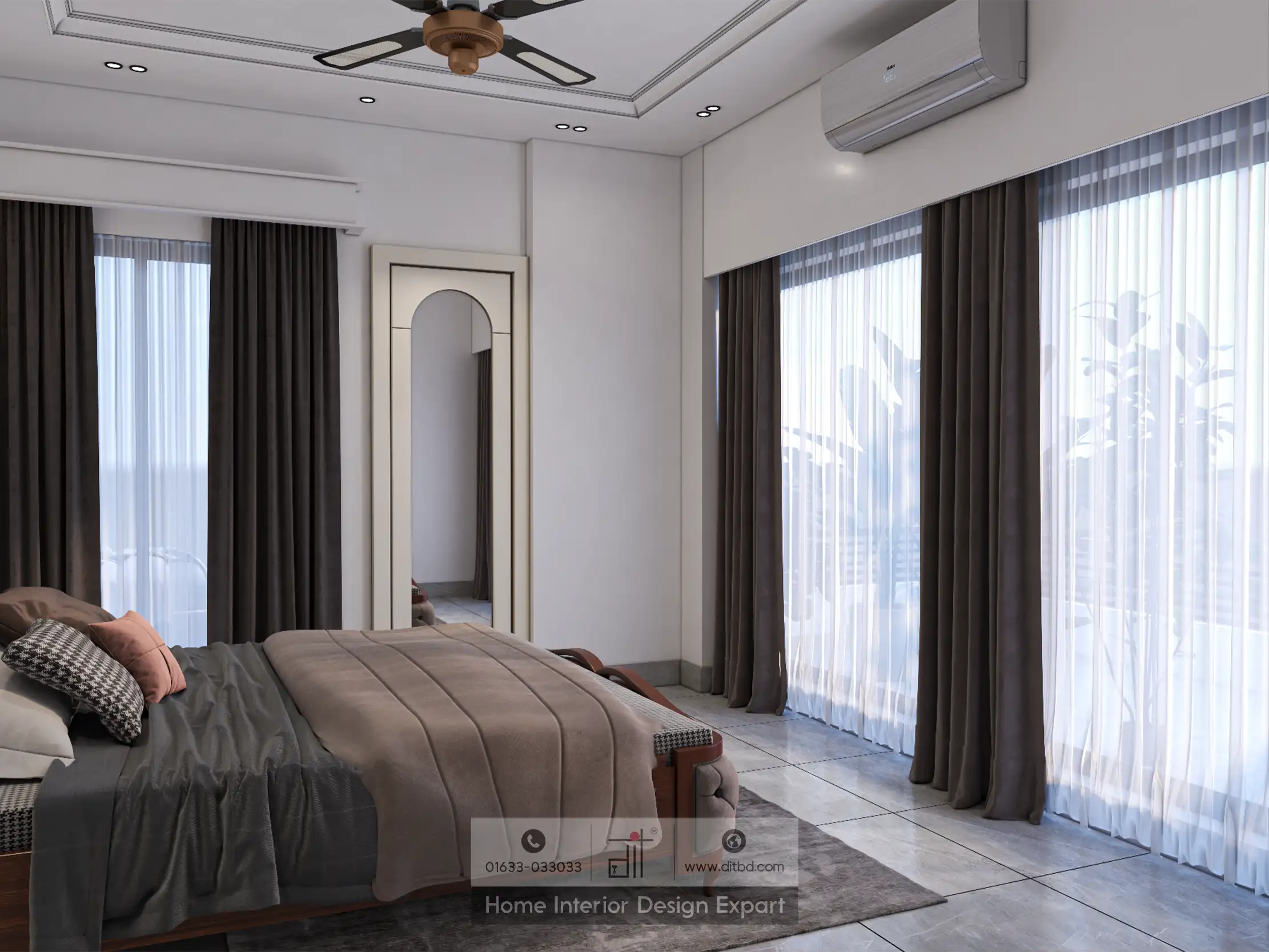 A ceiling fan with a modern design hangs from the intricately detailed ceiling, providing both functionality and aesthetic appeal. Large windows with sheer curtains allow natural light to flood the room, creating a bright and airy atmosphere. The curtains are paired with darker drapes that can be drawn for privacy and to control the light.