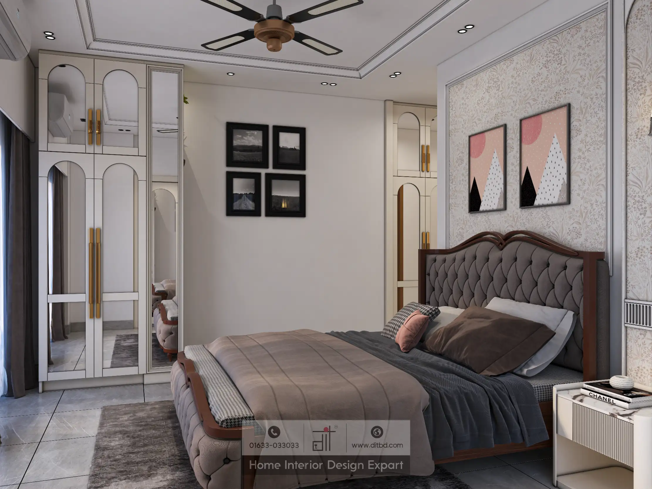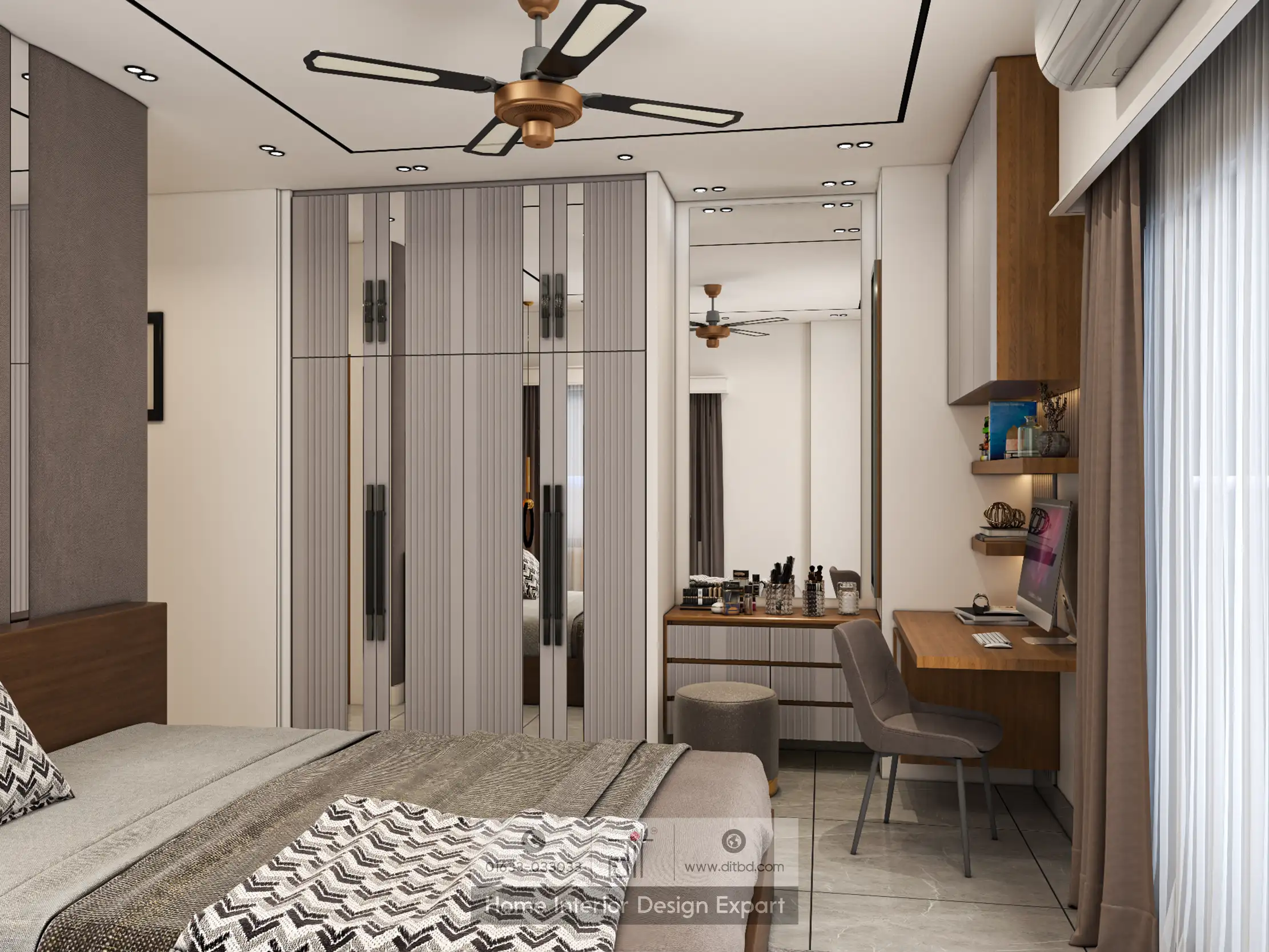 The design of DIT Studio’s minimal closet is a perfect blend of modern elegance and functionality. Your closet features sleek, floor-to-ceiling cabinetry with a combination of closed storage and open shelving. The closed storage units have smooth, handle-less doors that contribute to the minimalist look, while the open shelves provide space for decorative items and easy access to frequently used belongings. The use of neutral colors, such as white and light wood tones, enhances the sense of space and light within your room.