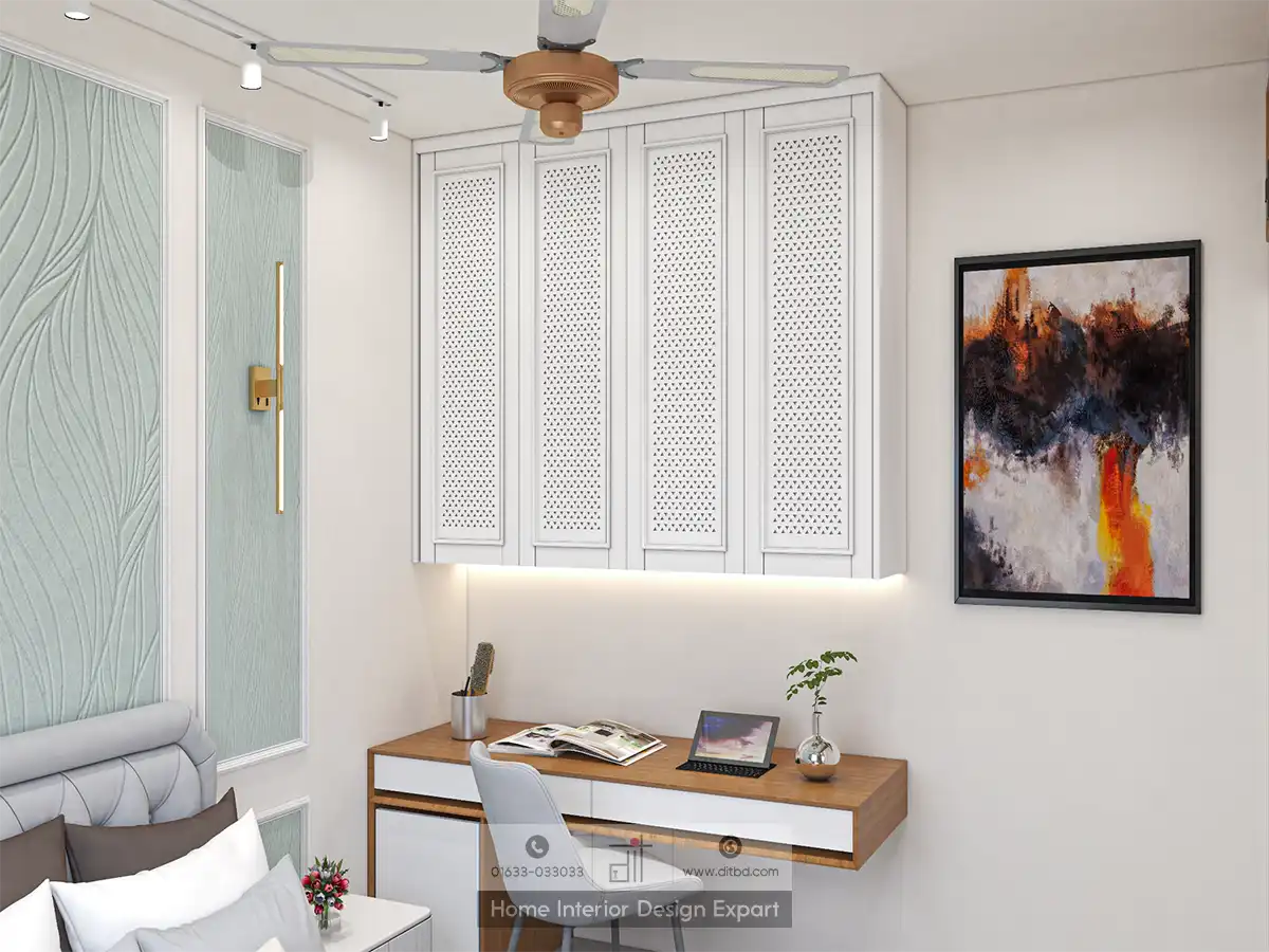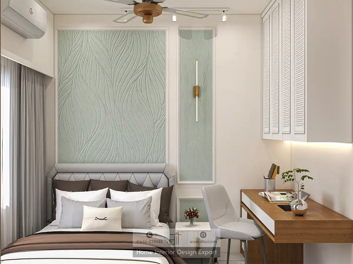 Above the bed, a textured minty green accent wall adds a subtle yet sophisticated touch to the space. This thoughtful design element not only enhances the room’s aesthetic but also provides a focal point that draws the eye. The wooden desk with a white top, accompanied by a sleek white chair, offers a perfect spot for your guests to catch up on work or enjoy a quiet moment with a book. The desk is adorned with a small plant, a laptop, and a book, adding a personal touch that makes the space feel lived-in and welcoming.