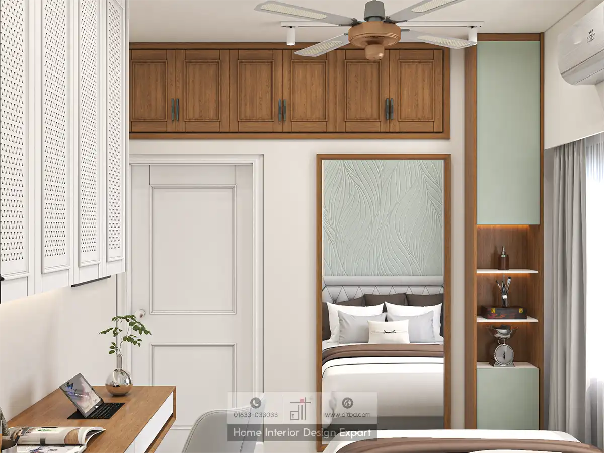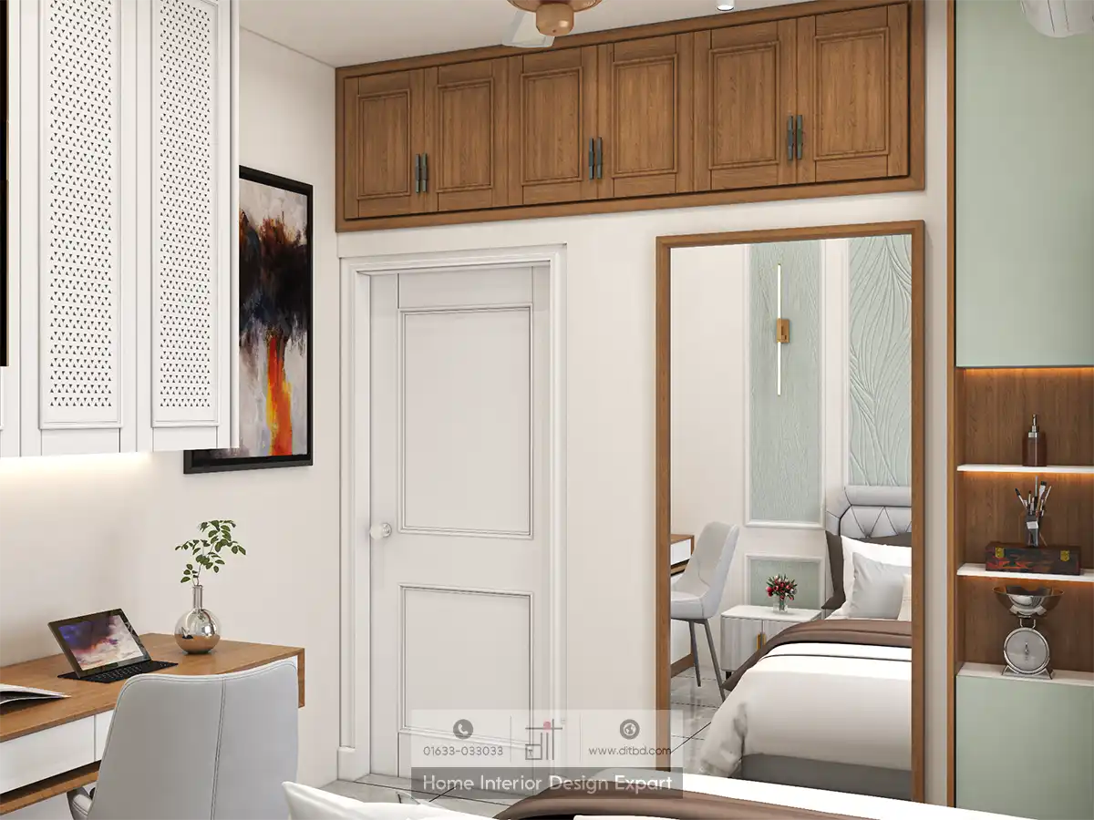 The large mirror with a wooden frame on one wall helps to make the room appear more spacious, while the built-in wooden shelves next to it provide ample storage for your guests’ belongings. The abstract art on the wall adds a pop of color and visual interest, making the room feel vibrant and dynamic.