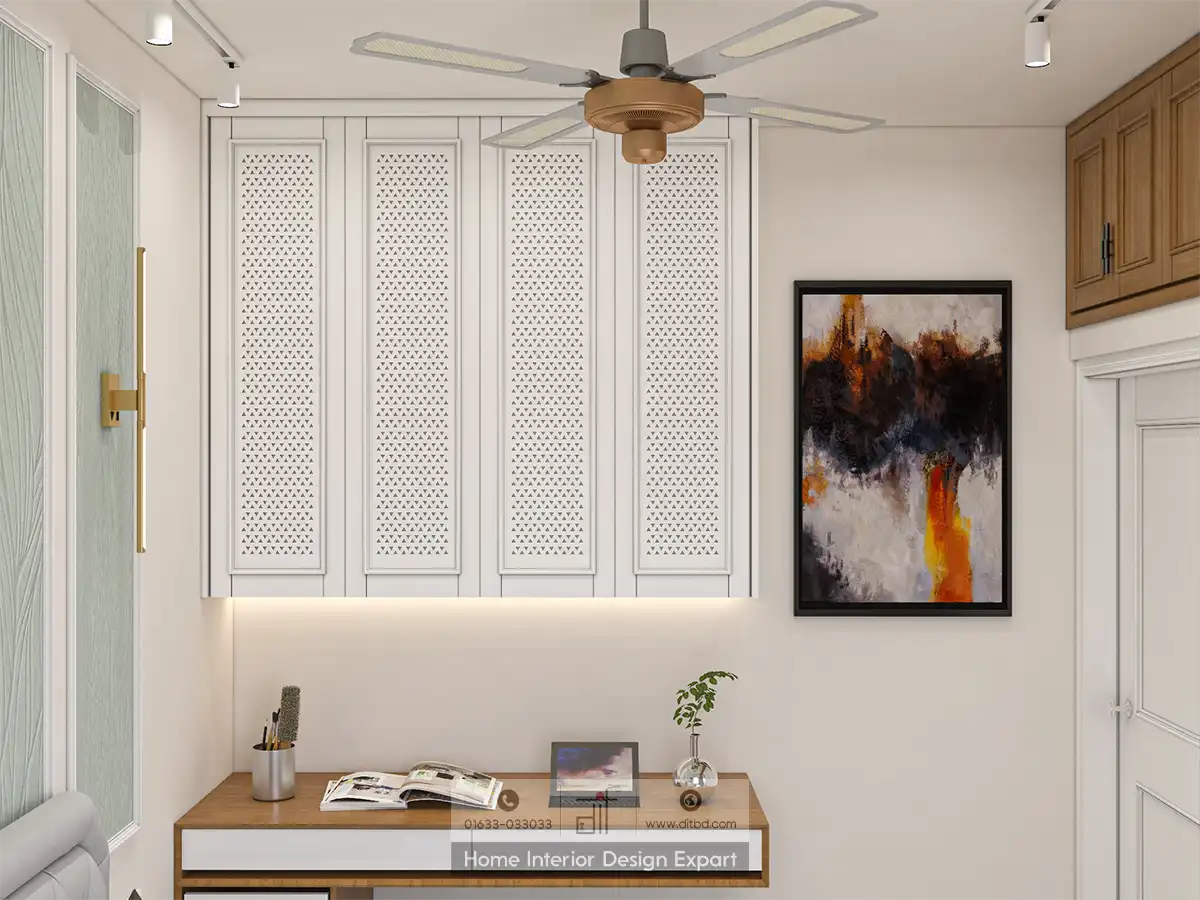 You have limited space at home does not mean that you will want any less for your guests. For them, you will need a minimal guest bedroom. The room is designed with a neutral color palette, featuring soft whites, light greys, and natural wooden tones that create a calming and inviting atmosphere. The bed, with its grey upholstered headboard and crisp white bedding, promises a restful night’s sleep for your guests. A cozy brown throw blanket adds a touch of warmth and comfort, making them feel right at home.