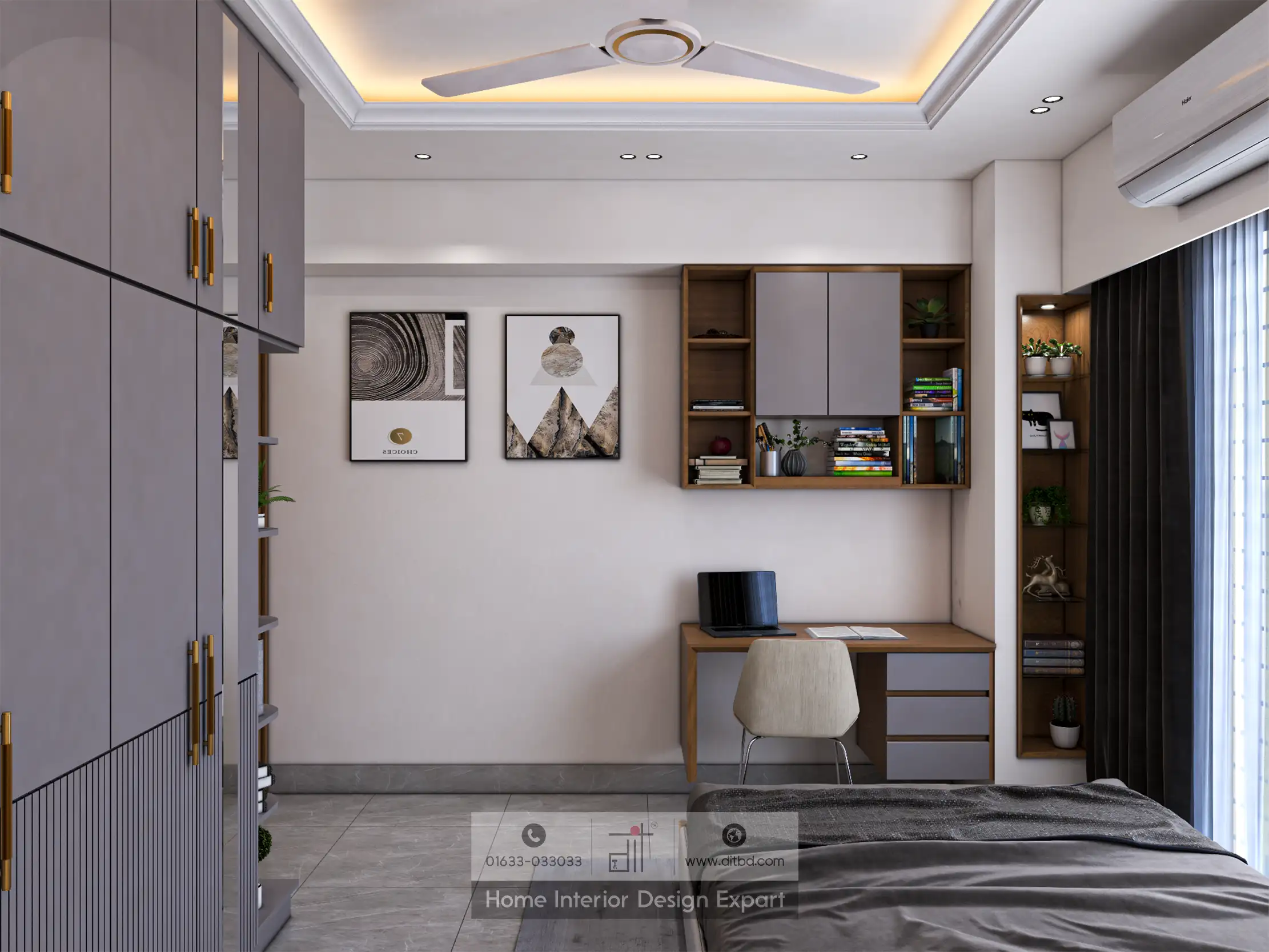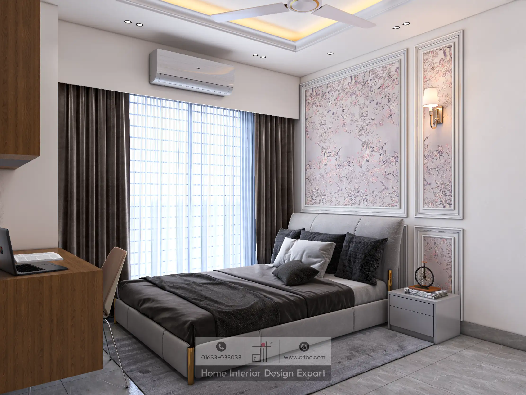 This is a modern bedroom design with a sleek and contemporary aesthetic. The bedroom features a large bed with a dark grey headboard and bedding, complemented by light-colored walls with intricate paneling and floral wallpaper accents. The room is well-lit with natural light from a large window covered by dark curtains. There is a ceiling fan with integrated lighting, and the ceiling has recessed lighting with a warm glow. The room includes built-in wardrobes with gold handles, providing ample storage space. A small desk area with a wooden chair and shelves is also present, making the room functional for both relaxation and work. The overall design is minimalist yet elegant, with a cohesive color palette of greys, whites, and wood tones, creating a calm and sophisticated atmosphere.