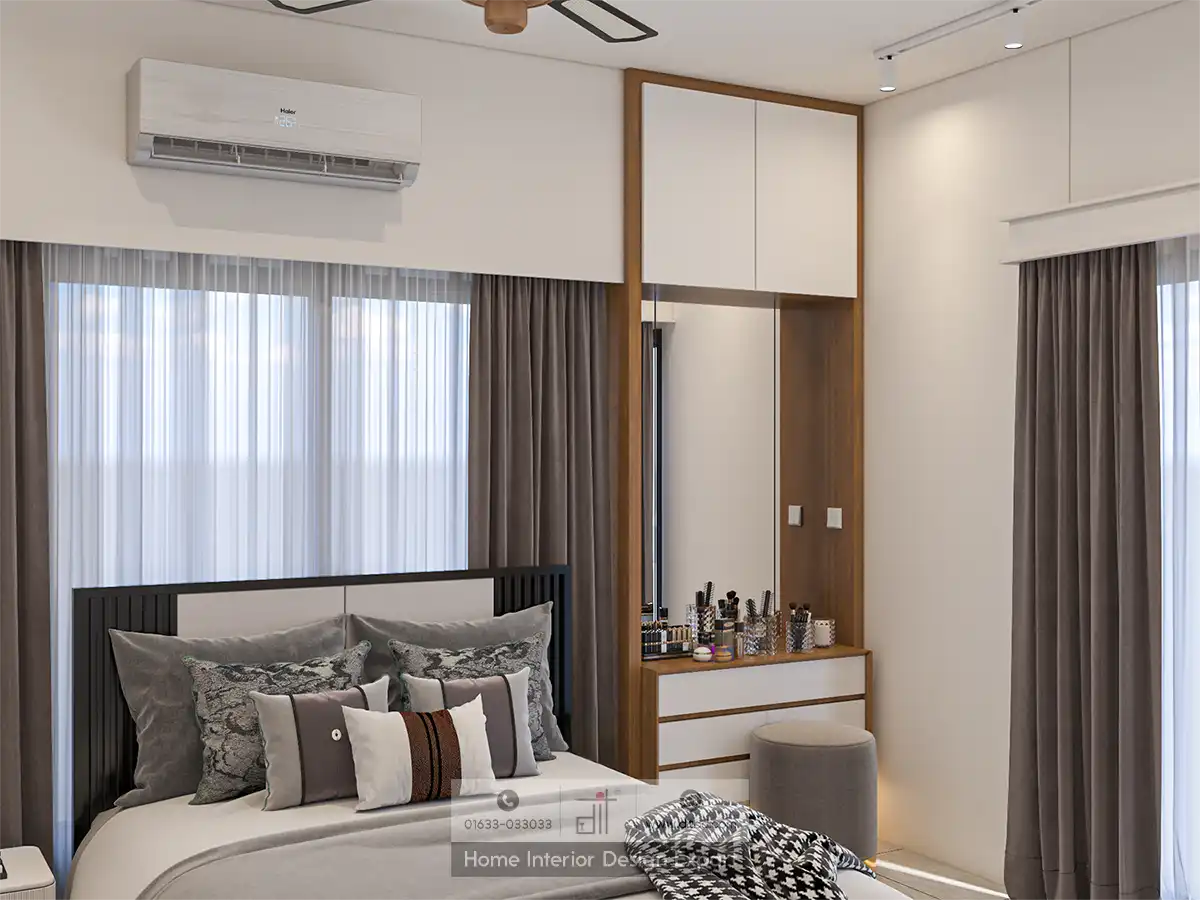 To the left of the bed, a cozy grey armchair and a small round side table provide a perfect spot for reading or relaxing. On the right side, a vanity area with a round mirror and a stool offers a functional space for grooming. The study area includes a desk, chair, and shelves filled with books and decor items, promoting a productive and organized environment.