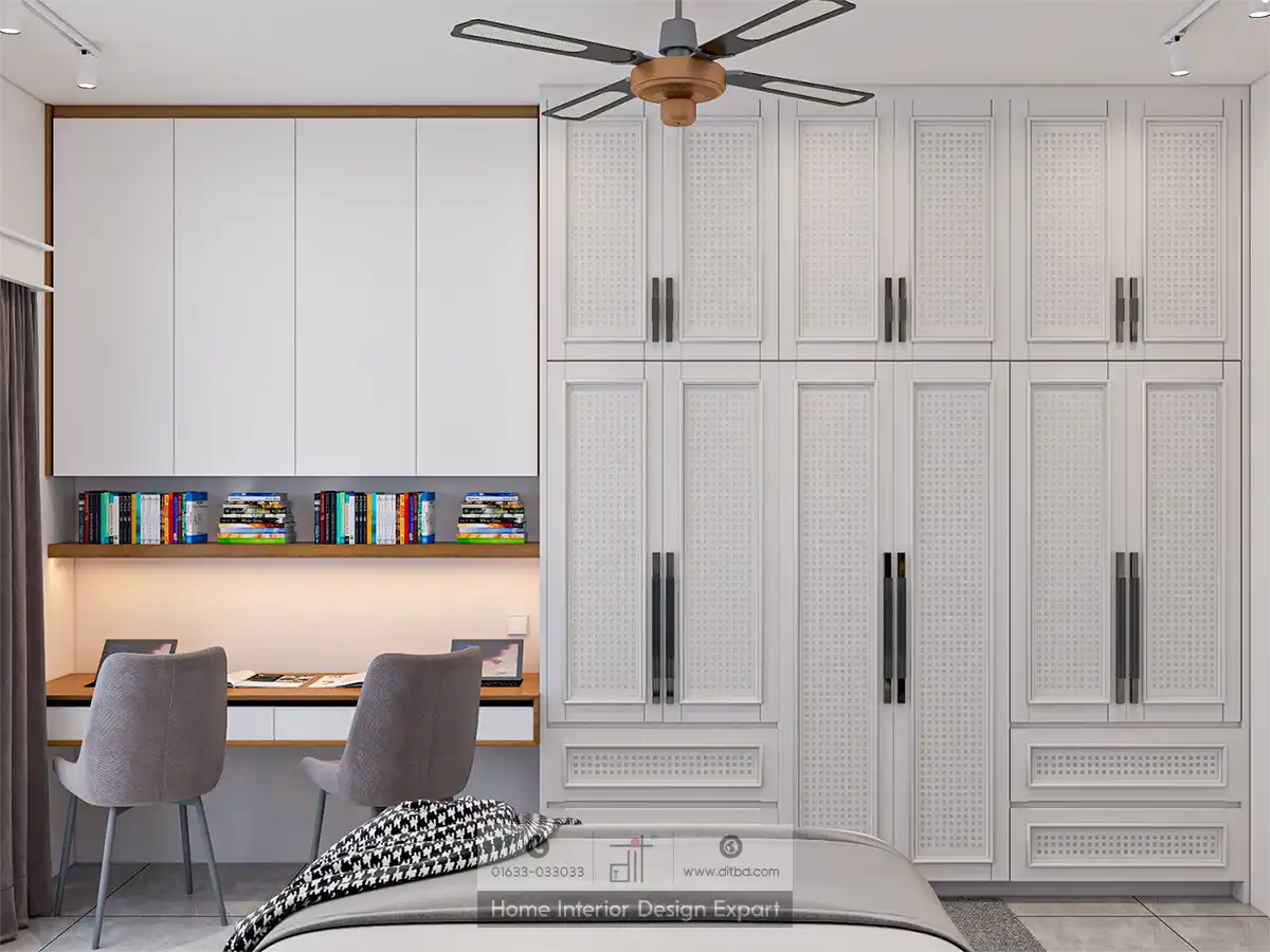 The wardrobe area features white paneled doors with long handles, providing ample storage space for clothes and accessories. The room is well-lit with recessed lighting and natural light from the window. The overall color scheme of neutral tones, accented with grey, white, and wood, creates a calm and inviting atmosphere, making it an ideal space for a child to grow and thrive.