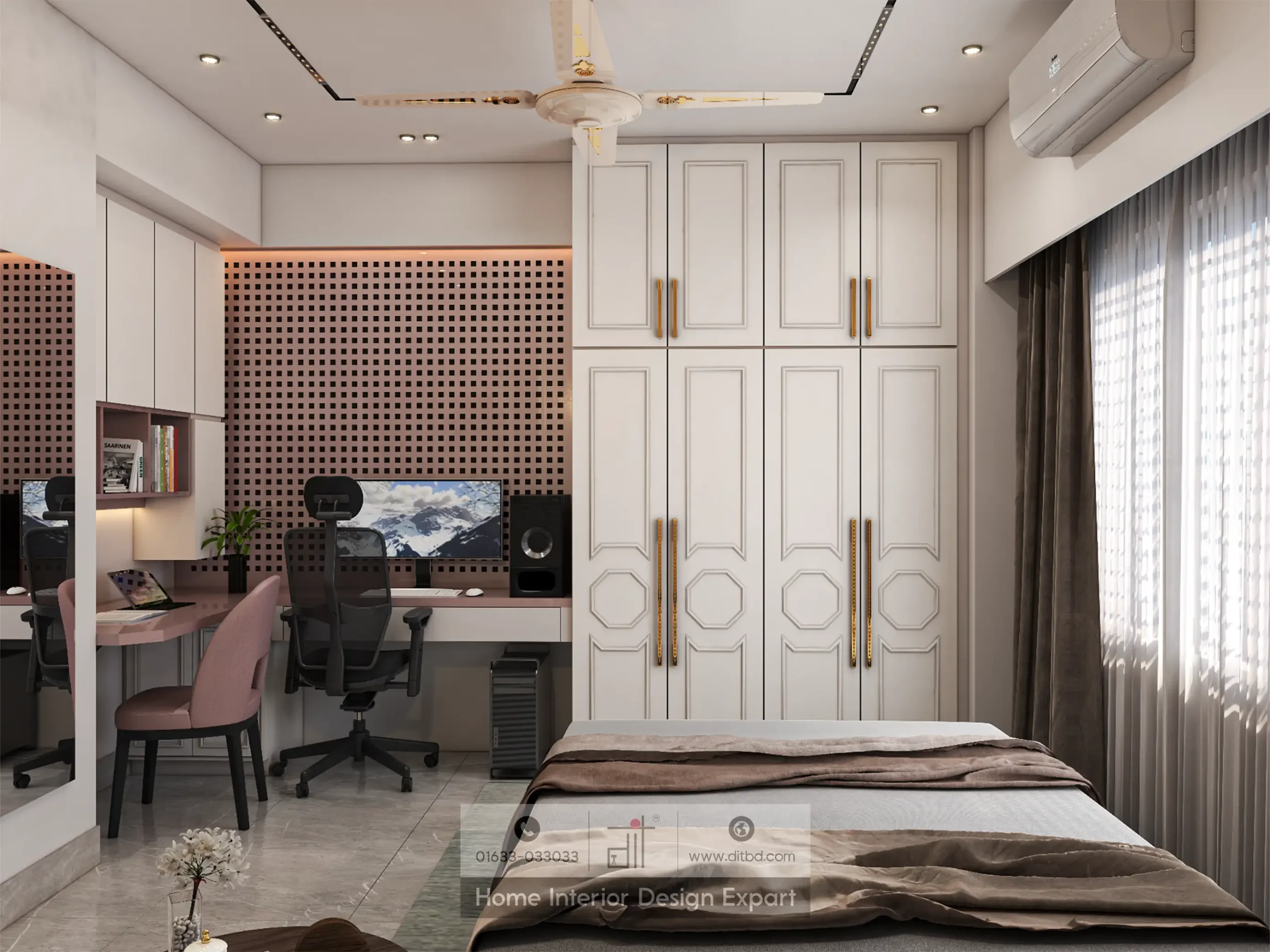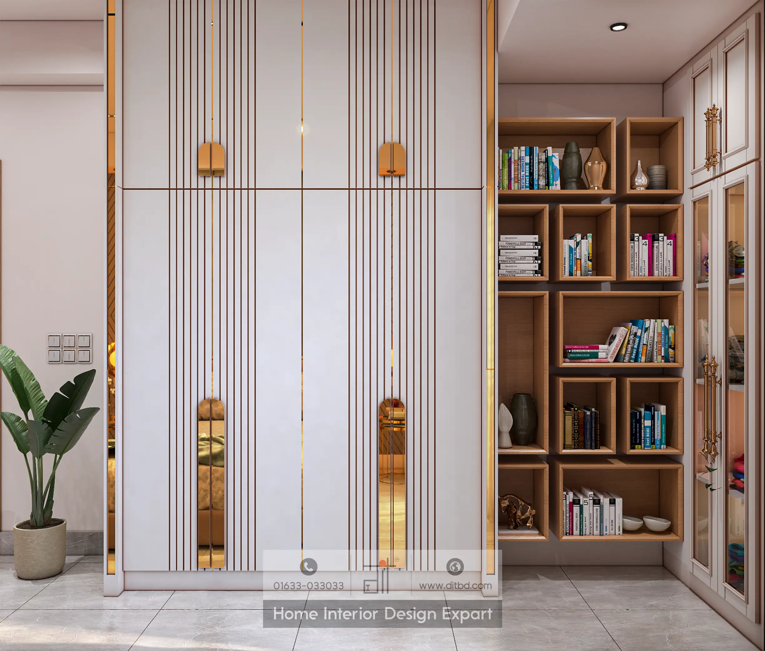 The modern closet interior shows a blend of elegance and practicality. The closet features sleek, white-paneled doors with vertical gold accents, creating a luxurious and clean aesthetic. The closet is thoughtfully organized with designated areas for hanging clothes, shelves for folded garments, and drawers for accessories. This setup maximizes storage space while maintaining a streamlined and sophisticated look. The overall design is cohesive, combining both form and function to create a harmonious and stylish storage solution.