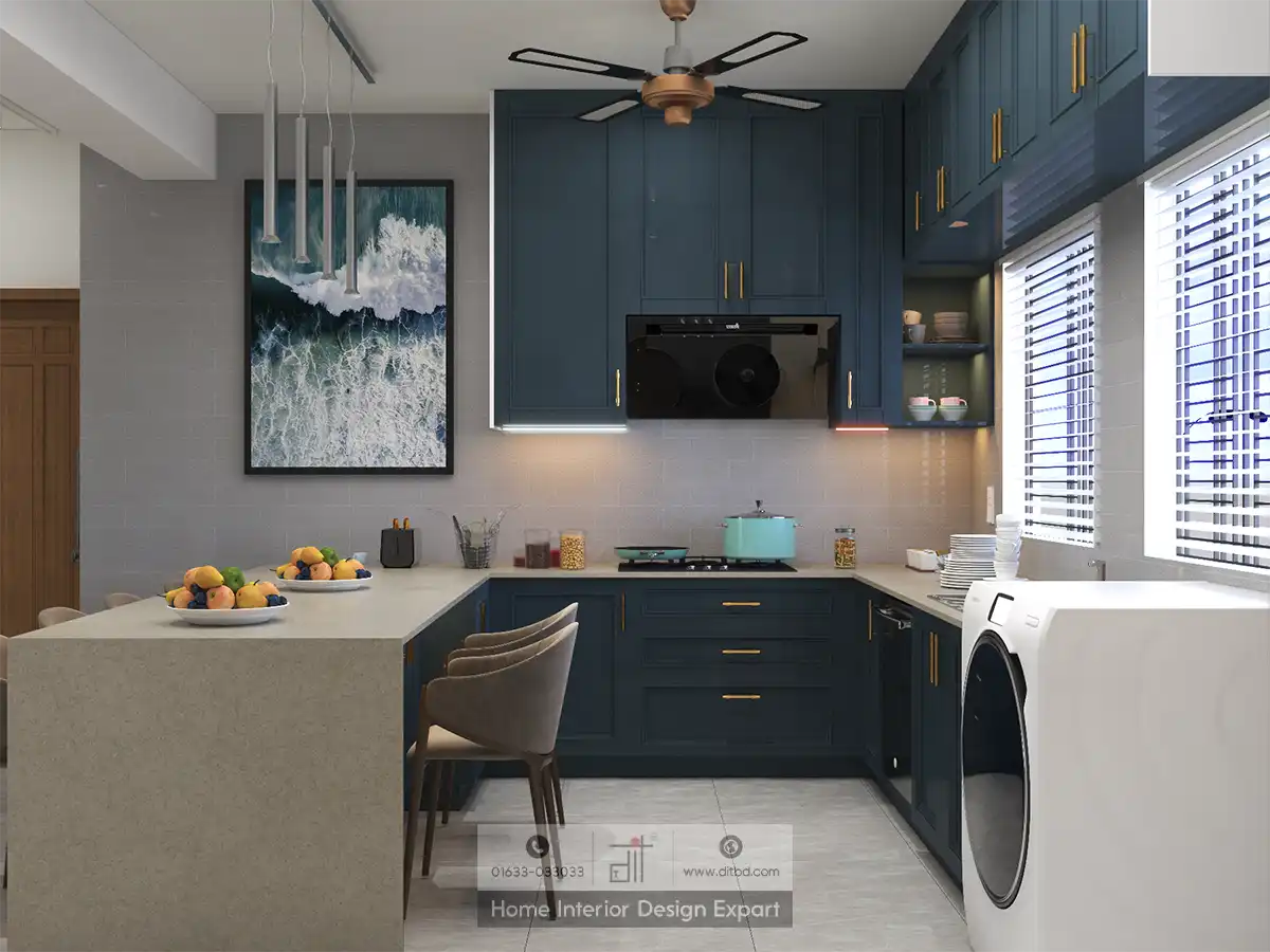 The kitchen itself is a masterpiece of modern design, with sleek cabinetry, state-of-the-art appliances, and a spacious island that doubles as a breakfast bar. The countertops are made of high-quality materials, providing both durability and elegance. The thoughtful layout ensures that everything you need is within easy reach, making meal preparation a breeze.