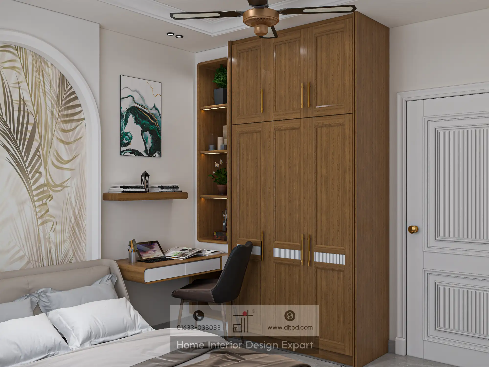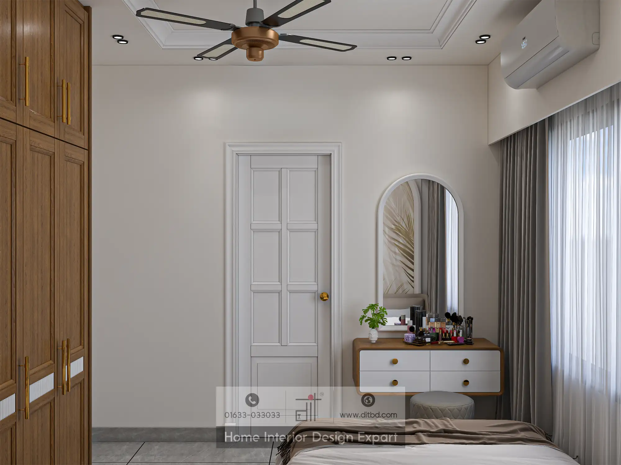 The room also features a spacious wardrobe with wooden doors, providing ample storage for guests. A ceiling with strategically placed recessed lighting adds a warm glow to the room. A small vanity area with a mirror and a potted plant adds a personal touch, making the space feel more homely and welcoming. Overall, the design by DIT Studio is a perfect blend of style, comfort, and functionality, making it an ideal guest bedroom.