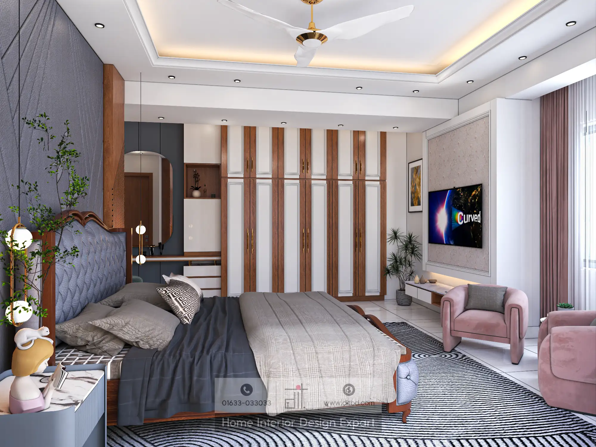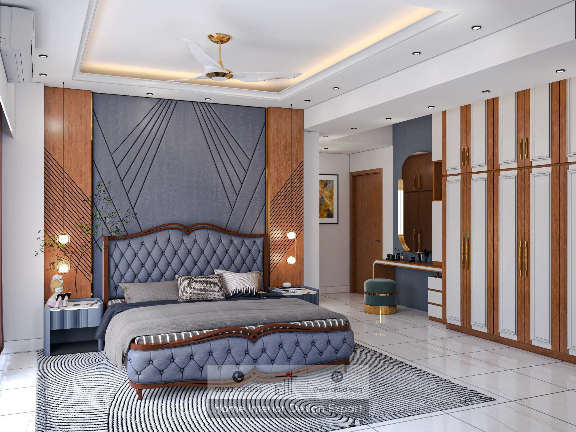 The modern master bedroom design interior is a stunning blend of elegance and functionality. The room features a large, comfortable bed as its centerpiece, complemented by sleek nightstands and ambient lighting that create a relaxing atmosphere. The use of neutral tones with wooden accents adds warmth and sophistication, enhancing the room’s overall aesthetic appeal.