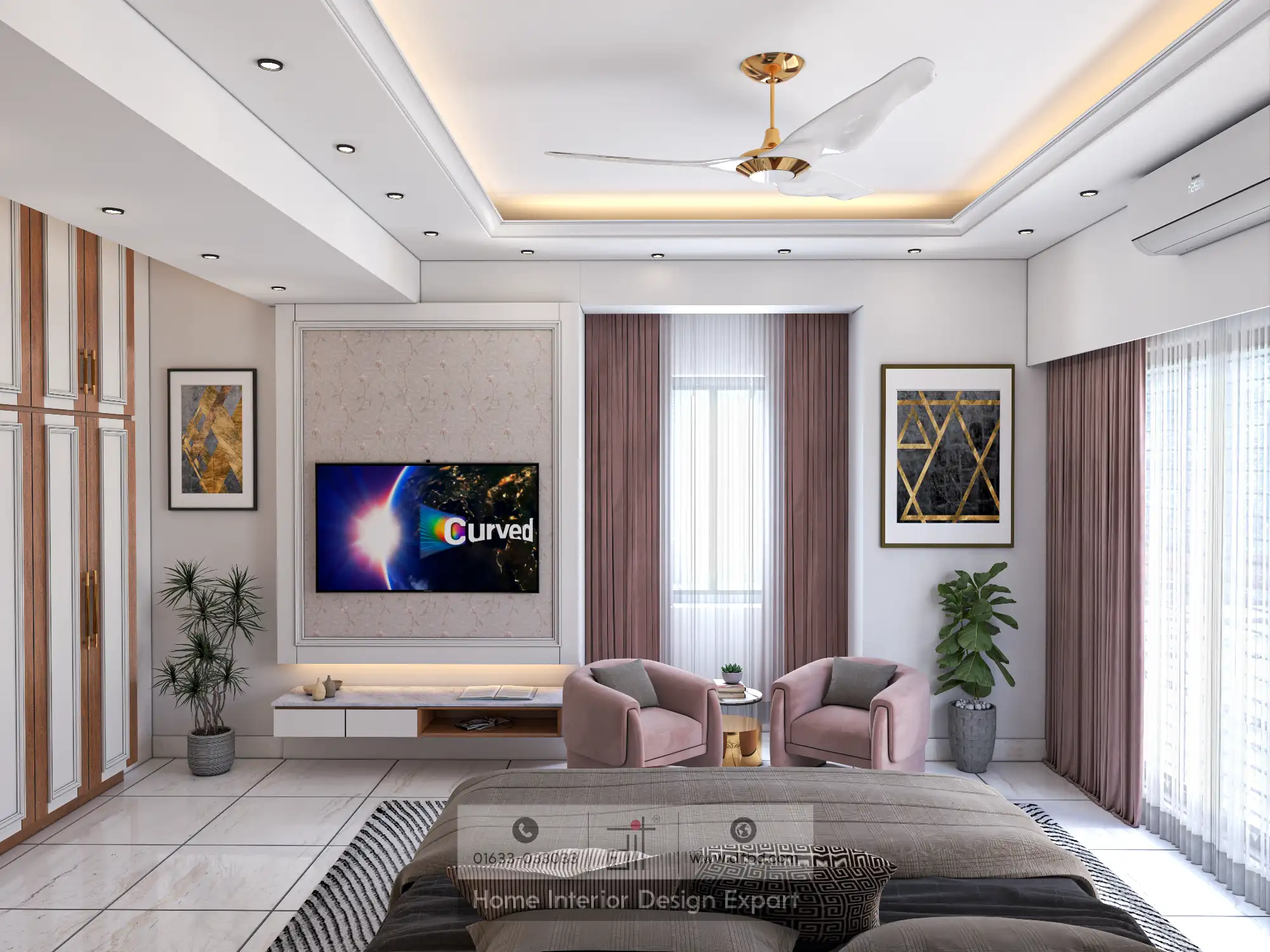 Space maximization is achieved through built-in wardrobes that provide ample storage without compromising the room’s open and airy feel. The addition of a cozy seating area with plush chairs offers a perfect spot for relaxation or reading. Large windows allow natural light to flood the space, creating an inviting and bright environment.