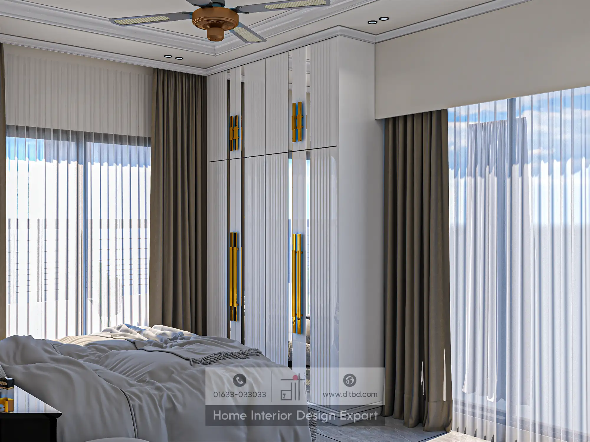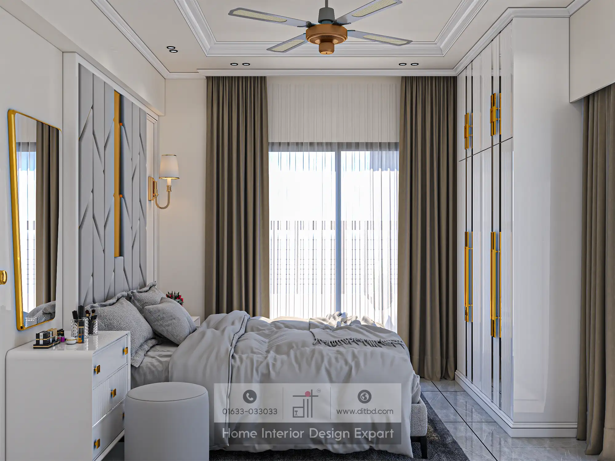 The large windows, adorned with sheer white curtains and grey drapes, allow natural light to flood the room, creating a bright and airy atmosphere. The sleek, white wardrobe with gold handles provides ample storage for your belongings, keeping your space organized and clutter-free. A full-length mirror on one wall not only adds a touch of glamour but also helps make the room feel more spacious.