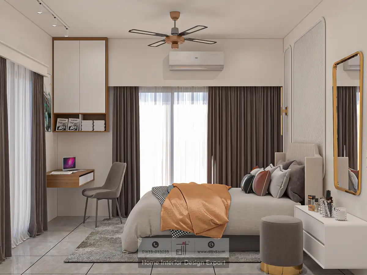 As you look around, the room includes a small vanity area with a mirror and a stool, perfect for your morning routine. There is also a built-in desk with a chair and shelves, offering a functional workspace within the comfort of your bedroom.