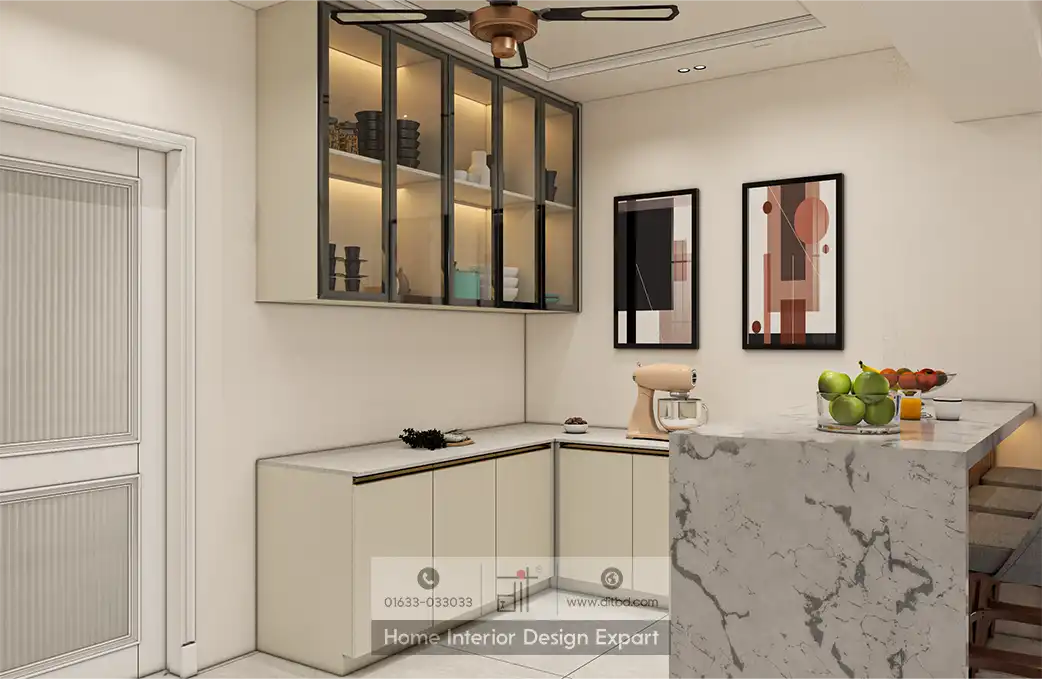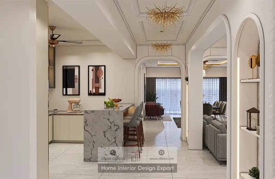 DIT Studio’s modern open kitchen is designed to be both functional and stylish, featuring a sleek and contemporary aesthetic. The kitchen includes light-colored cabinetry and countertops, with a marble island serving as the focal point. The island has a built-in sink and seating area with high chairs, making it a versatile space for both cooking and dining. The kitchen is well-lit with recessed lighting and a ceiling fan, adding to the modern aesthetic. Decorative elements such as framed artwork on the walls and a chandelier in the adjacent living area, visible through the open layout, enhance the overall design.