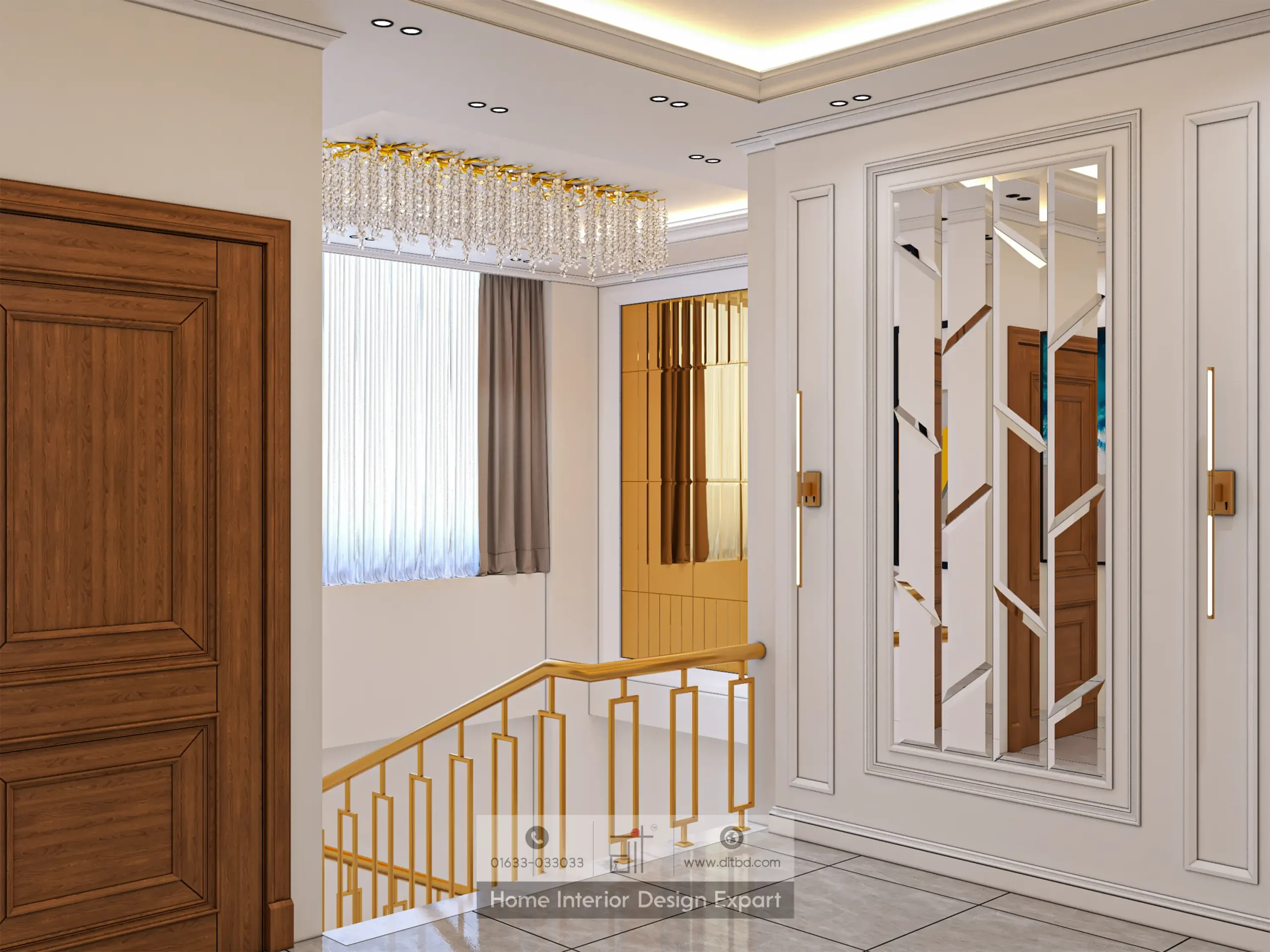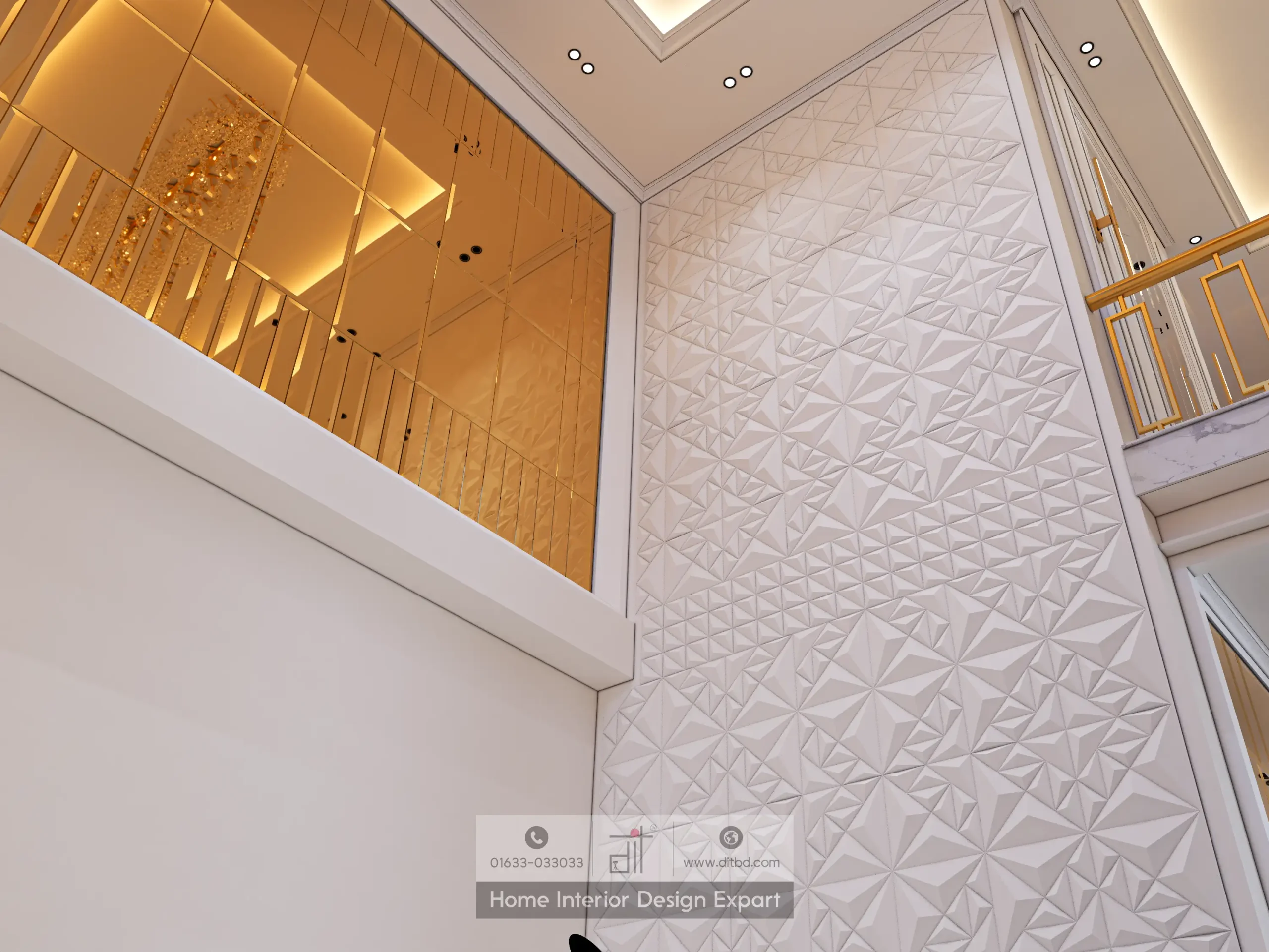 Large, reflective golden panels on the upper walls and ceiling amplify the sense of space and light, making the area feel more expansive and grand. The lighting fixtures, including a stunning chandelier, cast a warm and inviting glow throughout the space, enhancing the overall ambiance.