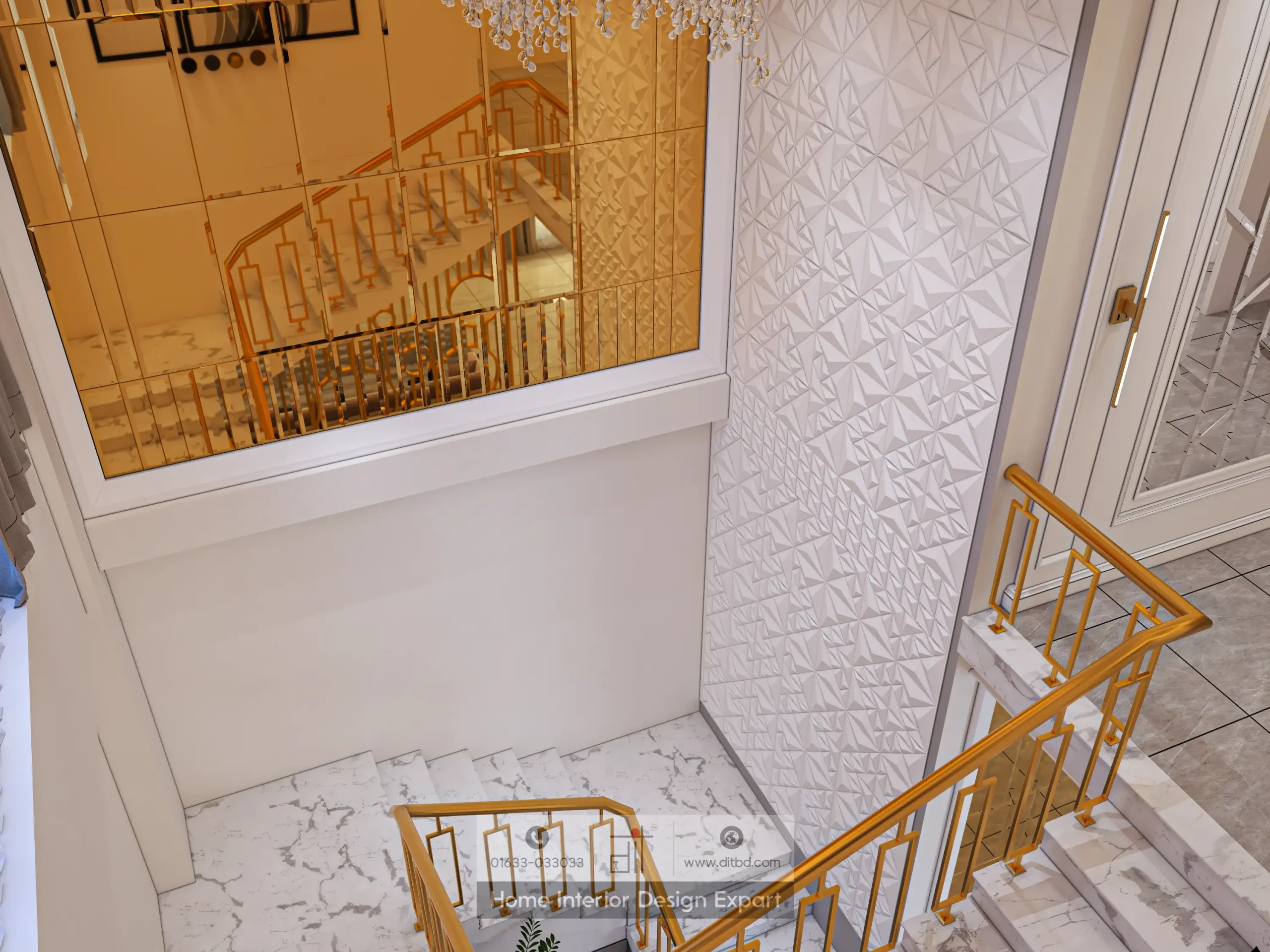 This modern staircase designed by DIT Studio features sleek, golden railings that add a touch of opulence and sophistication. The steps are crafted from polished marble, creating a luxurious and timeless look. The walls surrounding the staircase are adorned with intricate geometric patterns, adding visual interest and texture to the space.