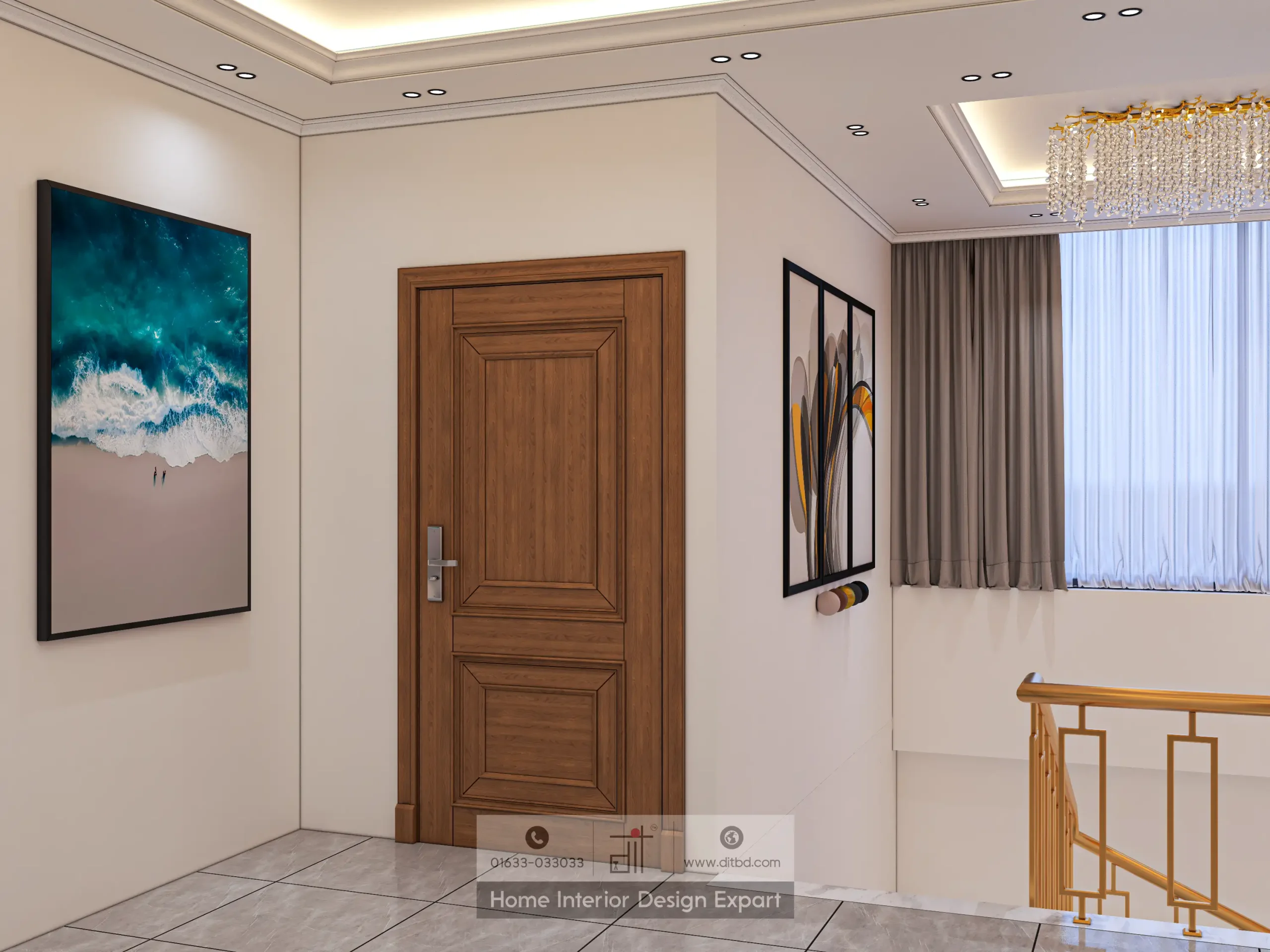 The thoughtful arrangement of decorative elements, such as potted plants and artwork, adds personality and character to the interior. The use of neutral tones with pops of gold and blue creates a harmonious and balanced color palette, making the design both stylish and welcoming. This modern stair design by DIT Studio is not only visually striking but also functional, seamlessly integrating various elements to create a cohesive and inviting environment.
