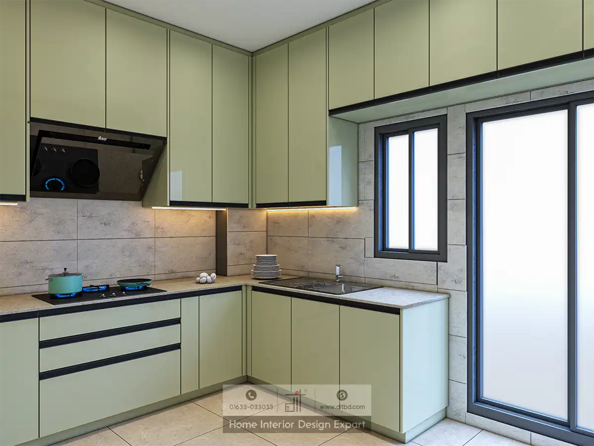 It is a modular kitchen design with a modern and sleek aesthetic. The kitchen features a U-shaped layout with ample storage space provided by upper and lower cabinets. The cabinets are a light green color, which adds a fresh and contemporary feel to the space. The countertops are white, complementing the light green cabinets and enhancing the overall brightness of the kitchen.