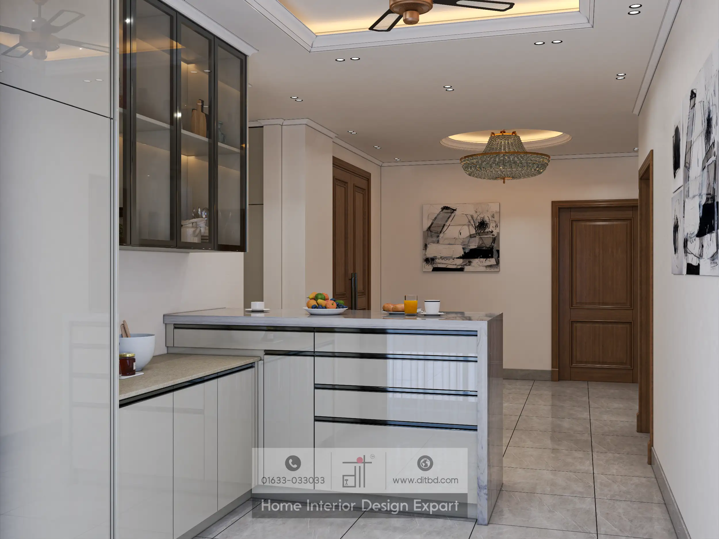 The open kitchen design features a centrally located kitchen island with a marble countertop and a wooden panel, complemented by high stools for seating. The island is paired with white cabinetry that includes glass-front upper cabinets with internal lighting, adding both functionality and elegance. Natural light streams in through large windows with sheer curtains, enhancing the sense of space. The room is equipped with a ceiling fan and recessed lighting, creating a comfortable and well-lit environment. The overall layout and use of materials blend aesthetics and practicality, making the space both inviting and efficient for cooking and socializing.