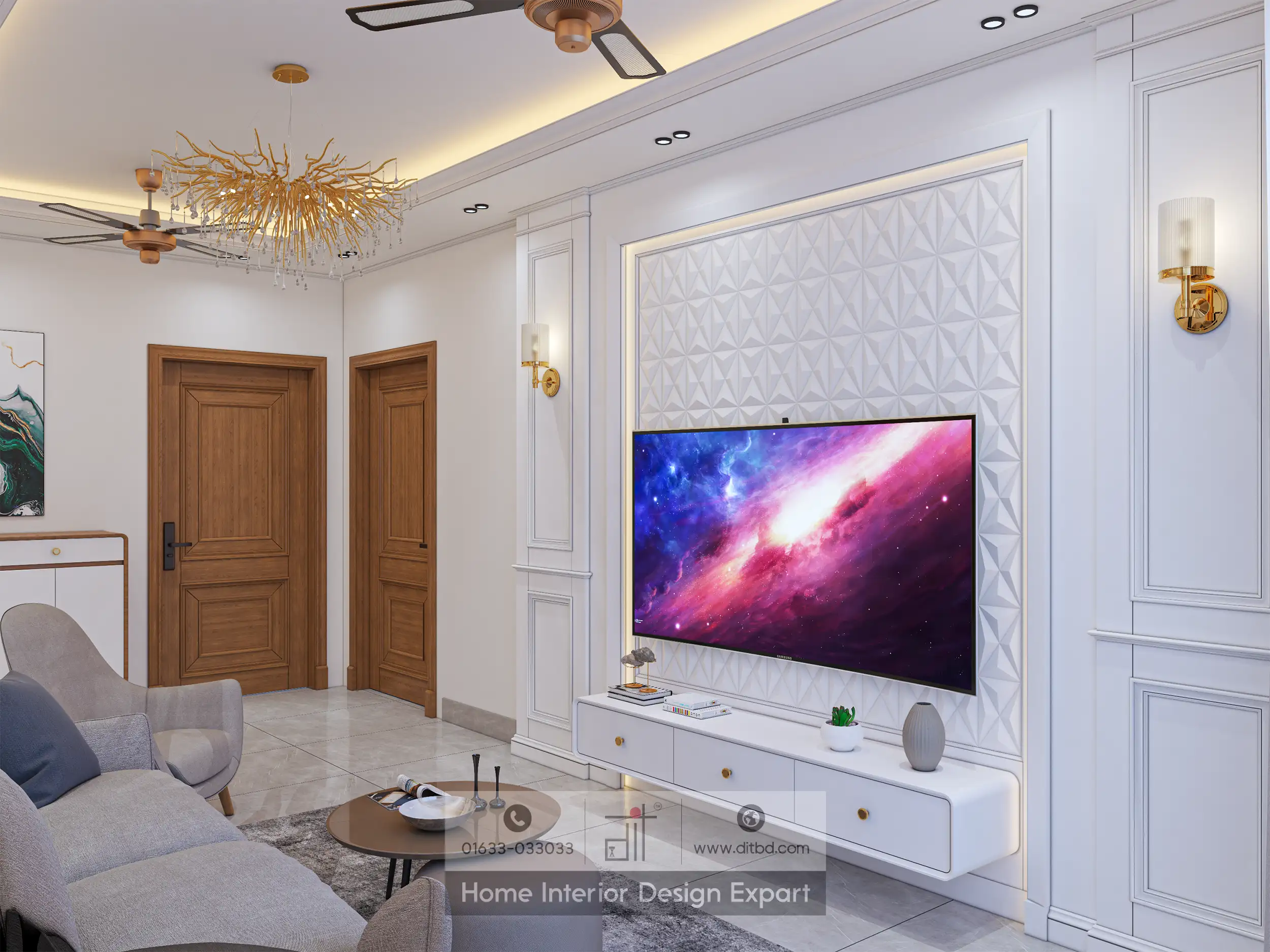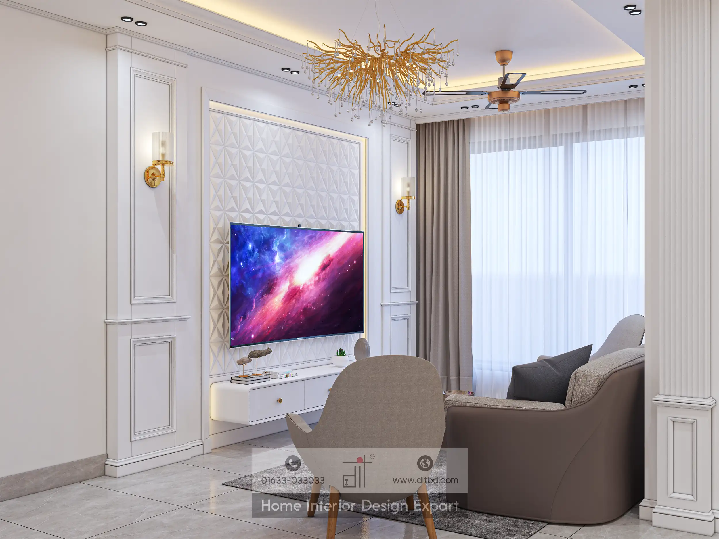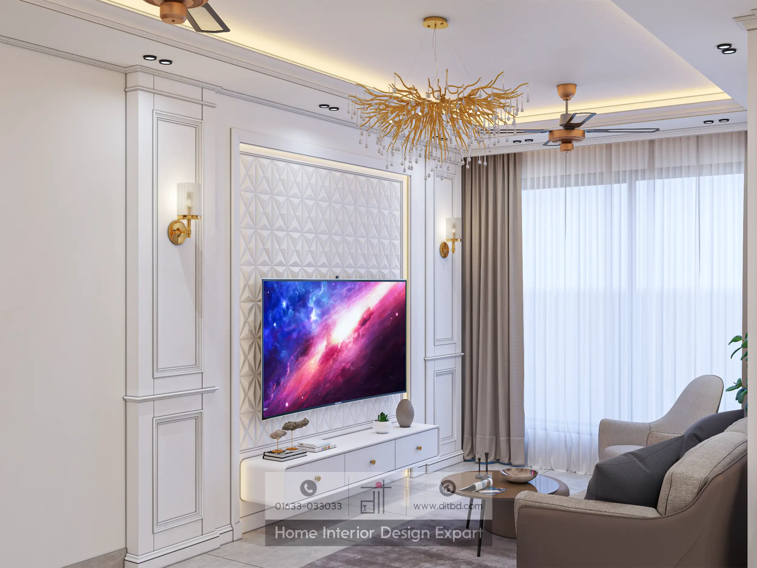 The TV cabinet design exudes modern sophistication and functionality. Integrating the cabinet into the wall, accented by built-in lighting and decorative panels, creates a seamless and elegant look. The use of neutral colors, combined with luxurious materials like marble and gold accents, adds a touch of opulence to the space.